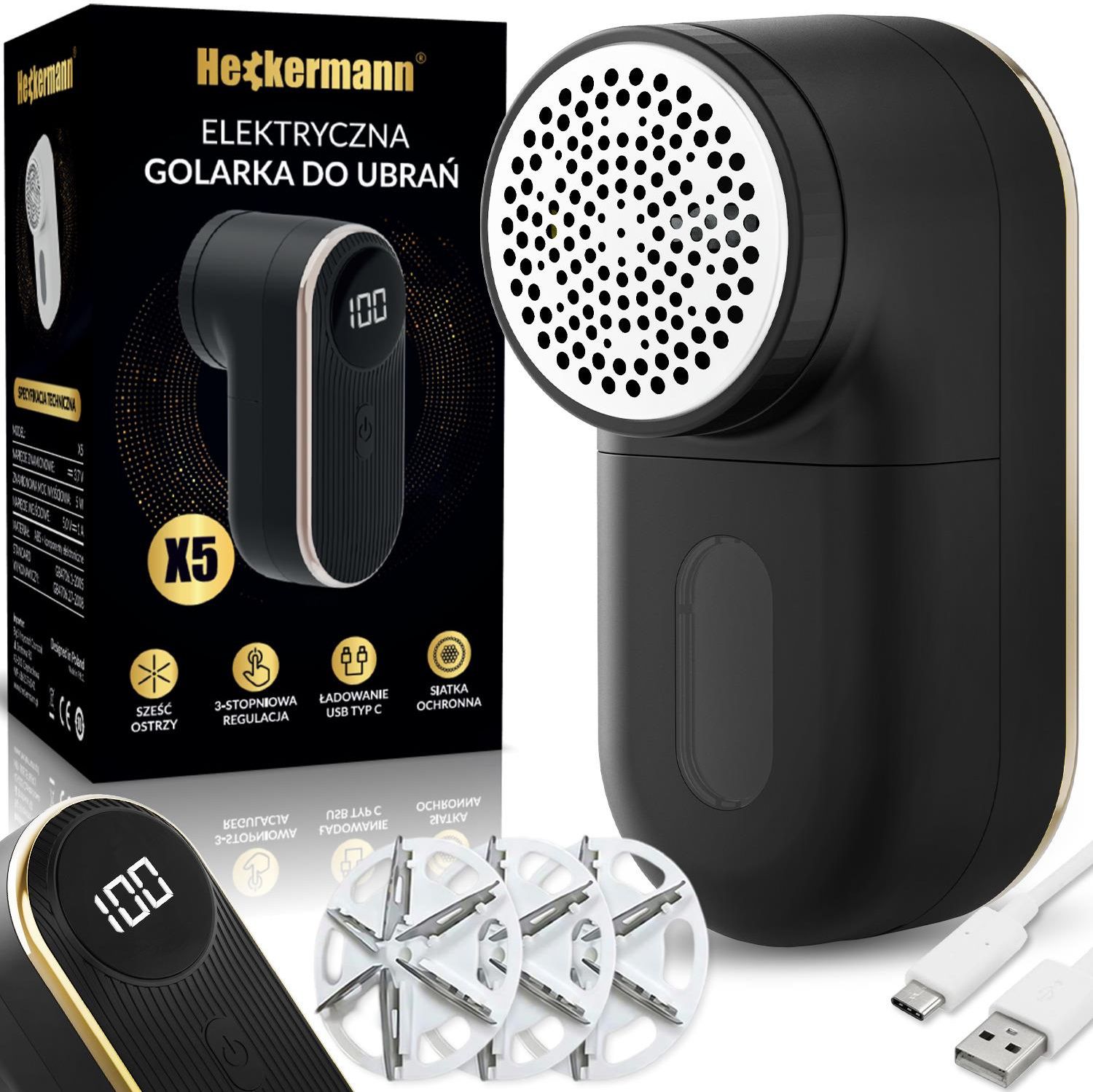 Elektryczna golarka do ubrań Heckermann X5 Czarna Heckermann X5 – Elektryczna golarka do ubrań, która przywróci Twoim ulubionym tkaninom nowy blask Twoje ulubione swetry, koszulki czy płaszcze zaczynają wyglądać na zużyte przez nieestetyczne zmechacenia? Heckermann X5, elektryczna golarka do ubrań w eleganckim czarnym kolorze, to rozwiązanie, które przywróci im dawną świetność. Z nowoczesnym designem, zaawansowaną technologią oraz wyjątkową funkcjonalnością, ten gadżet stanie się Twoim niezastąpionym pomocnikiem w dbaniu o odzież. Specyfikacja techniczna Zasilanie: USB C Czas ładowania: około 2 godzin Czas pracy po naładowaniu: 2-3 godziny Głowica noża: 6 ostrzy Wyświetlacz: LCD Materiał: ABS Waga: 280 g Design, który zachwyca – elegancja i praktyczność w jednym Czarny kolor golarki Heckermann X5 z subtelnymi złotymi akcentami sprawia, że urządzenie prezentuje się niezwykle stylowo. Elegancki wyświetlacz LCD informuje o stanie naładowania baterii, dzięki czemu zawsze wiesz, kiedy urządzenie jest gotowe do pracy. Kompaktowa i ergonomiczna konstrukcja sprawia, że golarka wygodnie leży w dłoni, a jej używanie to czysta przyjemność. Moc, precyzja i wydajność w każdym detalu Heckermann X5 wyposażono w sześć ostrzy wykonanych z wysokiej jakości stali, które skutecznie usuwają nawet najdrobniejsze zmechacenia i kłaczki. Dzięki trzystopniowej regulacji, możesz dostosować urządzenie do różnych rodzajów tkanin – od delikatnych swetrów po grubsze materiały, takie jak płaszcze. Specjalna osłona siatkowa chroni materiał przed uszkodzeniem, co czyni Heckermann X5 bezpiecznym wyborem nawet dla najbardziej wymagających tkanin. Niezależnie od tego, czy chcesz odświeżyć swój ulubiony kaszmirowy sweter, czy wyczyścić zimową kurtkę, ta golarka spełni Twoje oczekiwania. Ładowanie USB-C – komfort na miarę współczesności Zapomnij o problemach z bateriami – Heckermann X5 ładowana jest za pomocą nowoczesnego portu USB-C, co gwarantuje szybkie i wygodne ładowanie. Jedno pełne ładowanie wystarcza na wiele sesji czyszczenia, a kompaktowe wymiary sprawiają, że urządzenie bez problemu zmieści się w torbie podróżnej. Elektryczna golarka do ubrań Heckermann X5 to połączenie stylowego designu, zaawansowanej technologii i praktycznej funkcjonalności. Idealna dla osób, które chcą cieszyć się pięknym wyglądem swoich ubrań przez długie lata. Zamień zwykłą pielęgnację tkanin w profesjonalną troskę z urządzeniem, które nie ma sobie równych. Zainwestuj w Heckermann X5 i przekonaj się, jak łatwo możesz przywrócić swoim ubraniom dawną świetność!