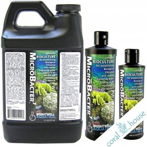 Brightwell Aquatics MicroBacter7 250ml - bakterie nitryfikacyjne do akwarium morskiego Brightwell Aquatics MicroBacter7 to złożony system niepatogennych tlenowych i beztlenowych bakterii, a także enzymów naturalnych, specjalnie opracowanych do ustanowienia filtracji biologicznej w nowych akwariach i zwiększenia szybkości nitryfikacji, denitryfikacji i ekologicznej degradacji odpadów w morskich i słodkowodnych akwariach przez całkowitą remineralizację składników odżywczych. Korzyści ze stosowania: Szybka redukcji węgla organicznego, amoniaku, azotynów, azotanów i fosforanów. Lepszy rozkład niezjedzonego pokarmu, odchodów oraz innych związków organicznych oraz osadów. Doskonale oczyszcza podłoże w akwarium bez konieczności jego ręcznego odmulania, dzięki czemu nie zakłóca się delikatnej równowagi biologicznej w akwarium. Przekształcanie szkodliwych związków organicznych do składników niezbędnych dla prawidłowego przebiegu procesu fotosyntezy. Znacznie obniżonej produkcji siarkowodoru. Wzrost stężenia rozpuszczonego tlenu. Przekształca fosforany w formy nieprzyswajalne przez niepożądane glony oraz sinice. Zwiększa przejrzystość i jakość wody. Dozowanie do zbiorników silnie zanieczyszczonych oraz nowozakładanych: Aby szybko i efektywnie pozbyć się zanieczyszczeń w akwarium oraz zaszczepić bakteriami filtry biologiczne w zbiorniku, dodawaj 5 ml (jedna nakrętka) preparatu na każde 95 litrów wody w akwarium codziennie przez kolejne 14 dni. Po okresie 14 dni rozpocznij dozowanie przeznaczone dla stabilnych zbiorników. Dozowanie dla stabilnych zbiorników Raz w tygodniu dodawaj 5 ml (jedna nakrętka) preparatu na każde 200 litrów wody w zbiorniku lub dodawaj codziennie 2 kroplę preparatu na 200 litrów wody w zbiorniku. Doświadczeni akwaryści posiadający dużą obsadę w zbiorniku mogą zwiększyć dozowanie preparatu, zaleca się jednak nie przekraczania 1 kropli na 40 litrów dziennie. Przy zmianie filtracji lub zwiększeniu obsady zbiornika zaleca się zastosować 1 kroplę preparatu na każde 95 litrów wody dziennie przez 7 kolejnych dni.