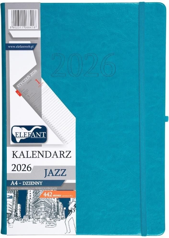 Jazz Kalendarz A4 dzienny turkusowy 2026 NOWY KOLOR W OFERCIE! • Jazz: kalendarz książkowy 2026 • format: A4• oprawa: twarda wykonana z wysokiej jakości materiału imitującego skórę• kolor: turkusowy• zamykany na gumkę w kolorze turkusowym• gumka na długopis w kolorze turkusowym• zaokrąglone narożniki opraw i stron• dwie tasiemki w kolorze turkusowym• pierwsze strony wewnątrz wraz z kopertą na tylnej oprawie w kolorze kremowym• układ: dzienny (sobota i niedziela na oddzielnej stronie)• liczba stron: 442 strony• gramatura papieru: 80 g/m2• papier w kolorze delikatnym chamois• wewnątrz: plan roku i rozkład roku 2026, specjalny planer do zarządzania zadaniami w czasie(np. planowanie urlopów, wakacji, wizyt klientów, zabiegów itp.) z podziałem na każdy miesiąc osobno, terminy ferii zimowych, święta oficjalne i zwyczajowe, podróże, informacje dla podróżnych, protokół powypadkowy w przypadku stłuczki, notes, skorowidz teleadresowy, kalendarium dodatkowe na 2025-2026-2027• wymiary: długość 297 mm, szerokość 210 mm, wysokość 32 mm• oprawa przygotowana do personalizacji kalendarza np. logo firmy, imię i nazwisko itp. NOWY KOLOR W OFERCIE! • Jazz: kalendarz książkowy 2026 • format: A4• oprawa: twarda wykonana z wysokiej jakości materiału imitującego skórę• kolor: turkusowy• zamykany na gumkę w kolorze turkusowym• gumka na długopis w kolorze turkusowym• zaokrąglone narożniki opraw i stron• dwie tasiemki w kolorze turkusowym• pierwsze strony wewnątrz wraz z kopertą na tylnej oprawie w kolorze kremowym• układ: dzienny (sobota i niedziela na oddzielnej stronie)• liczba stron: 442 strony• gramatura papieru: 80 g/m2• papier w kolorze delikatnym chamois• wewnątrz: plan roku i rozkład roku 2026, specjalny planer do zarządzania zadaniami w czasie(np. planowanie urlopów, wakacji, wizyt klientów, zabiegów itp.) z podziałem na każdy miesiąc osobno, terminy ferii zimowych, święta oficjalne i zwyczajowe, podróże, informacje dla podróżnych, protokół powypadkowy w przypadku stłuczki, notes, skorowidz teleadresowy, kalendarium dodatkowe na 2025-2026-2027• wymiary: długość 297 mm, szerokość 210 mm, wysokość 32 mm• oprawa przygotowana do personalizacji kalendarza np. logo firmy, imię i nazwisko itp.