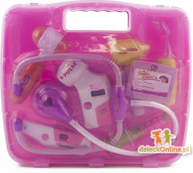 Zabawka edukacyjna, zestaw małego lekarza dla dzieci. Efekty dźwiękowe i świetlne. Zestaw zawiera: młoteczek, stetoskop, termometr, strzykawkę, plaster, lustereczko lekarskie, otoskop. Zasilanie: 2 baterie AG13, 8 baterii AG10 (w zestawie). Zestaw lekarza w walizce Światła niebieski Zestaw ten umożliwia małym adeptom medycyny na zapoznanie się z podstawowymi narzędziami używanymi przez lekarzy.Jest to wspaniała zabawa dla twoich dzieci oraz ich przyjaciół.5 spośród 8 narzędzi Małego doktora to zabawki elektroniczne które wydają dźwięki i świecą.Z pomocą Stetoskopu poczujesz jak bije serce twojej lalki -wydaje odgłos bicia serca,dodatkowo świecąca dioda jest w kształcie serca.Możesz też zbadać puls za pomocą Ciśnieniomierza-zobaczysz podświetlony wynik,termometr z kolei pokaże temperaturę na podświetlonym wyświetlaczu.Podświetlone lusterko lekarskie pomoże zbadać stan jamy ustnek.Z pomocą Stetoskopu sprawdzisz słuch ,np:twoich pluszowych przyjaciół. Wszystkie narzędzia małego lekarza mieszczą się w poręcznej walizeczce,która pozwoli przenieść zabawę twoim maluchom gdzie tylko chcą Pomaga oswoić się dziecku z wizytą u lekarza Uczy podstawowych czynności medycznych W skład zestawu wchodzi stetoskop z efektami dźwiękowymi termometr z efektami świetlnymi ciśnieniomierz z efektami świetlnymi przyrząd do badania uszu z efektami świetlnymi strzykawka młotek plakietka dla lekarza przyrząd do sprawdzania gardła z lusterkiem i efektami świetlnymi Całość zapakowana w praktyczną i wygodna walizkę łatwe przechowywanie Specyfikacja Zasilanie: 2x baterie AG13, 8x baterie AG 10 (w zestawie) Wymiary opakowania: 27cm x 24cm x 5,5cm Przeznaczona dla dzieci od 3 roku życia Posiada certyfikat CE Produkt fabrycznie nowy, zapakowany w oryginalne opakowanie