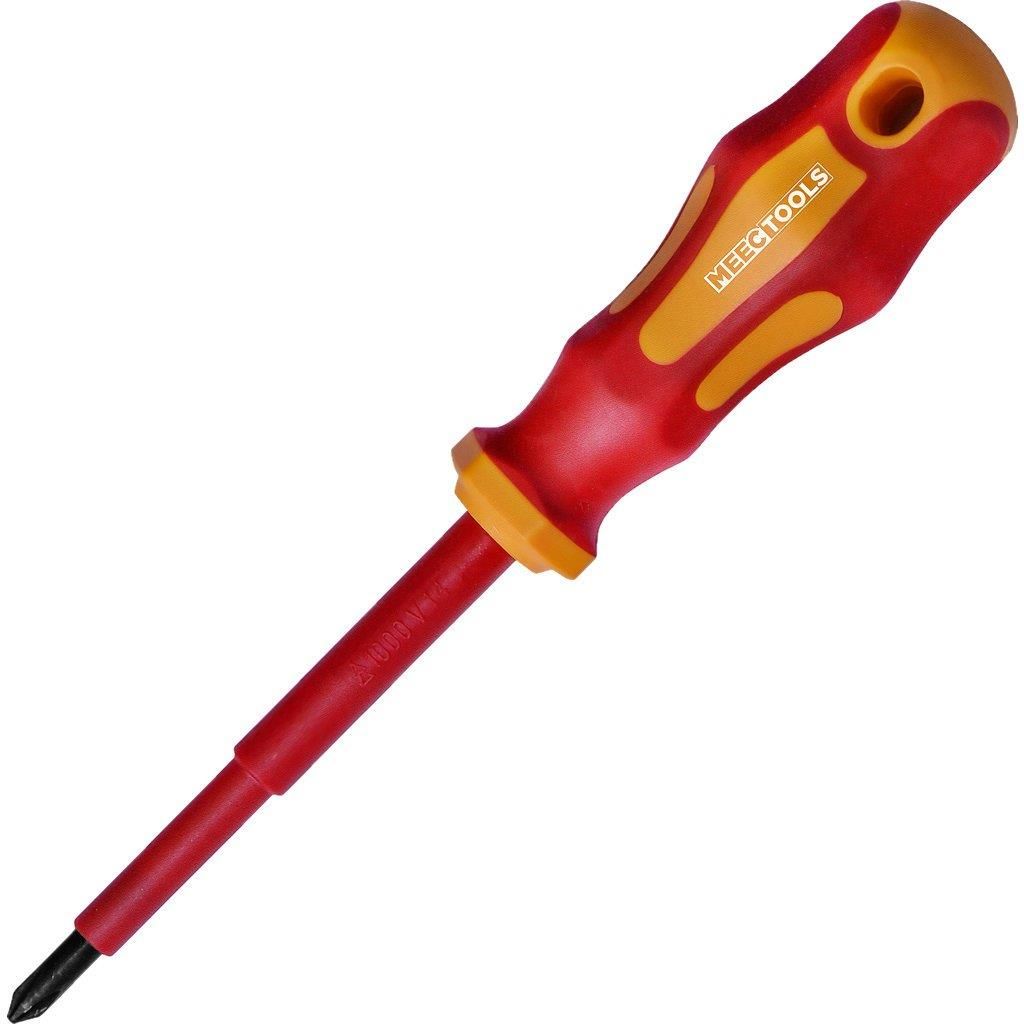 Wkrętak do prac elektrycznych, do wkrętów z nacięciem krzyżowym.Wkrętak Phillips izolowany marki Meec Tools jest przebadany i atestowany do 1000 V zgodnie z normą EN 60900. Jest wykonany ze stali chromowo-wanadowej i ma gumowany uchwyt dwuskładnikowy zapewniający stabilny chwyt.