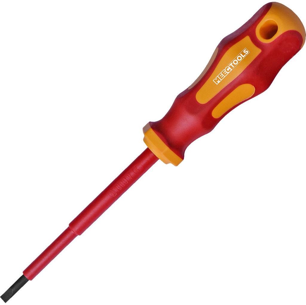 Wkrętak do prac elektrycznych, do wkrętów z nacięciem prostym.Wkrętak płaski izolowany marki Meec Tools jest przebadany i atestowany do 1000 V zgodnie z normą EN 60900. Jest wykonany ze stali chromowo-wanadowej i ma gumowany uchwyt dwuskładnikowy zapewniający stabilny chwyt.