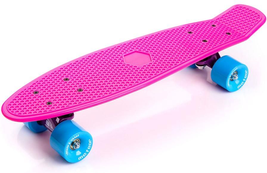 Deskorolka firmy Meteor to najnowszy trend wśród fanatyków jazdy na deskorolce. Dzięki swoim niewielkim wymiarom, i szerokim kółkom gwarantuje szybkie i zwrotne przemierzanie ulic i alejek. Nowoczesne aplikacje i kolory przyciągną wzrok każdego na Twojej drodze. Plastikowa deska slalomowo - cruisingowa z poliuretanowymi kołami jest bardzo lekka i zdecydowanie mniejsza niż typowe deskorolki. Dzięki temu możliwa jest prosta i szybka zmiana kierunku jazdy oraz perfekcyjne wykonywanie ruchów, a przenoszenie deski nie stanowi problemu. Antypoślizgowa powierzchnia uniemożliwia zsunięcie się z deskorolki, a poliuretanowe kółka dostosowują się do podłoża amortyzując wstrząsy.Model stanowi reaktywację niezwykle popularnych winylowych deskorolek z lat 70" i 80" Dane techniczne:- materiał: deck - PVC; truck - aluminium; kółka - PU- wymiary decka: 56 x 14,6 x 1 - 2,1 cm- wymiary kółek: 6 x 4,5 cm- łożyska: ABEC-5