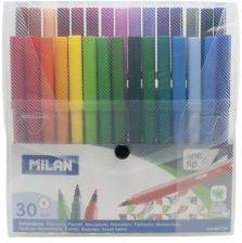 Flamastry 30 kolorów Milan Zestaw 30 flamastrów w plastikowym etui w kształcie walizeczki. Flamastry z wytrzymałą i elastyczną stożkową końcówką o średnicy 5 mm, która nie wpada do środka nawet przy silnym nacisku. Po chwilowym odkształceniu końcówka zawsze wraca do pierwotnego kształtu. Pozwala na rysowanie cienkich i grubych linii (od 3 mm do 0,75 cm). Tusz na bazie wody. Żywe, intensywne kolory. Wentylowana skuwka. Flamastry MILAN są zgodne z europejskimi i amerykańskimi normami bezpieczeństwa. Nie zawierają ftalanów, metali ciężkich i innych substancji toksycznych. Są bezpieczne dla dzieci.