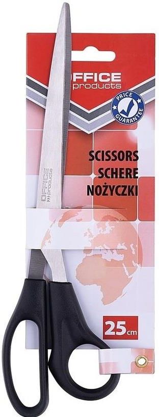 Nożyczki biurowe OFFICE PRODUCTS, 25 cm, czarne satynowe ostrze wykonane ze stali nierdzewnej o bardzo wysokiej jakości cechują się niezwykle wytrzymałą rączką odporną na pęknięcia i odpryski uniwersalne – do cięcia papieru, kartonu, tektury, zdjęć, taśmy samoprzylepnej, itp. charakteryzują się …