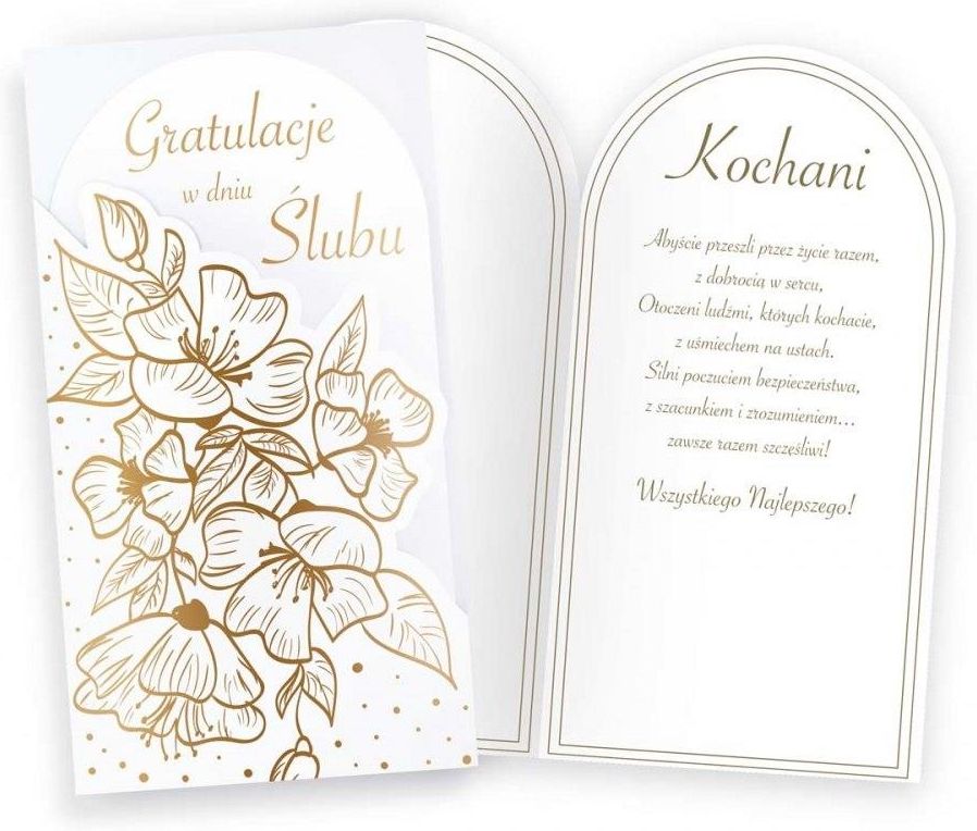 Kartka na Ślub z serii Passion Moments PM-244 Każda kartka w kolekcji Passion Moments to małe arcydzieło - wyjątkowe i niepowtarzalne, świetne w dotyku, piękne wizualnie, po prostu niepowtarzalne. Kartki PM są bardzo bogato zdobione, a jednocześnie skromne i stylowe, cały efekt tkwi w detalach i doskonałym wykonaniu. W zależności od wzoru, na kartkach znajdują się dekoracje ze złotej, srebrnej, perłowej lub holograficznej folii, a także doklejki biżuteryjne, kokardki, brokat, laserowe wycięcia, wstążeczki i inne dodatki. Wnętrze karnetu to zawsze atrakcyjna grafika i tekst życzeń. Kartki mają w komplecie dopasowaną kopertę. Cechy szczególne: wielkość po złożeniu: 11,4 x 21,5 cm zdobienie: przynajmniej dwie folie metaliczne/perłowe/holograficzne , brokat, elementy doklejane, wycięcia laserowe, wstążeczki - w zależności od wzoru, wnętrze: z delikatną grafiką, wyjątkowe życzenia w środku, w komplecie: dopasowana kolorystycznie koperta, okazja: ślub.