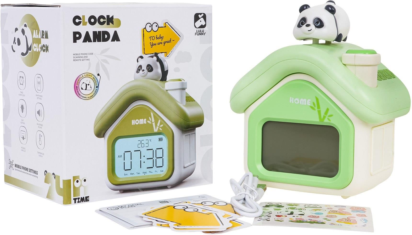 Opis Zegarek Budzik Panda Elektroniczny zegar, budzik dla dzieci od trzeciego roku życia. Idealny jako budzik jak i dekoracja pokoju dziecięcego. Duża pojemność akumulatora i ładowanie kablem typu C. Subtelne oświetlenie nocne nie zakłóca snu w nocy. Zegar wyposażono we wskaźnik temperatury, minutnik, wskaźnik naładowania baterii, duży przejrzysty wyświetlacz, alarmy i tryb drzemki. Zegar idealnie sprawdzi się podczas nauki samodzielnego kładzenia się spać i wstawania. W zestawie mamy również karty, na których możemy wpisać plan dnia, kartki ze strzałkami, naklejki dekoracyjne i kabel do ładowania typu C. Zegar zasilany jest akumulatorem typu 3,7 V 1200 mAh (w zestawie). W instrukcji znajduje się kod do aplikacji umożliwiającej pobranie różnych dzwonków. Funkcje: dla dzieci od trzeciego roku życia, możliwość pobrania dzwonków przez aplikację (kod na instrukcji), ładowany kablem typu C, uroczy wygląd, czytelny ekran cyfrowy, alarm z funkcją drzemki, lampka nocna, wskaźnik temperatury, minutnik, wskaźnik naładowania baterii, przejrzysty wyświetlacz, możliwość resetu urządzenia, solidna konstrukcja, do zestawu dołączono kartki, na których możemy wpisać plan dnia, kartki ze strzałkami i naklejki dekoracyjne. Wymiary - zegar ok. 12,7 cm x 9,5 cm x 16,4 cm, - opakowanie ok. 13,5 cm x 14,5 cm x 10 cm. Zawartość zestawu budzik, kabel do ładowania typu C, instrukcja obsługi (angielska i chińska), 5 x karty z planem dnia, 5 x karta ze strzałkami, naklejki dekoracyjne.