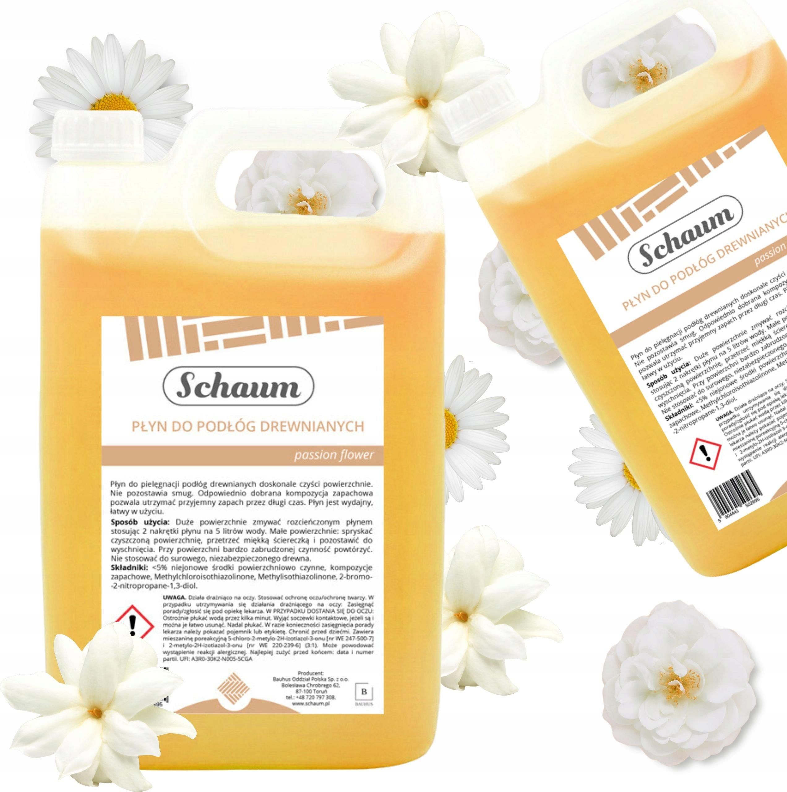 Płyn do podłóg paneli drewnianych 5L Schaum Zanurz się w świeżości i delikatności z naszym płynem do podłóg o zapachu Passion Flower. Ten wyjątkowy produkt łączy w sobie skuteczność i piękno natury, tworząc idealny sposób na utrzymanie czystości w Twoim domu. Zapomnij o zwykłym myciu podłóg – teraz możesz doświadczyć prawdziwej przyjemności z każdym krokiem. Zalety Zapach Passion Flower: To nie jest po prostu zapach. To zaproszenie do odkrycia piękna natury w Twoim własnym domu. Aromat kwiatów passion flower jest nie tylko przyjemny dla zmysłów, ale także potrafi wpłynąć na Twoje samopoczucie, tworząc atmosferę harmonii i spokoju. Niezrównana skuteczność: został opracowany z myślą o maksymalnej skuteczności w usuwaniu wszelkich zabrudzeń. Niezależnie od tego, czy mamy do czynienia z plamami z jedzenia, odciskami stóp czy codziennym kurzem, nasz produkt radzi sobie z nimi bez trudu, pozostawiając powierzchnie nie tylko czyste, ale także odświeżone. Chroni drewno przed uszkodzeniami i przedwczesnym zużyciem, co zwiększa jego trwałość. Praktyczne opakowanie 5L to gwarancja długotrwałego użytkowania. Nie pozostawia smug ani osadu. Idealny do mycia ręcznego, automatycznego lub różnymi rodzajami mopów. Tak prosty w użyciu i efektywny, że nawet dziecko sobie poradzi z idealnym umyciem podłogi! Sposób użycia Duże powierzchnie zmywać rozcieńczonym płynem stosując 2 nakrętki płynu na 5 litrów wody. Małe powierzchnie: spryskać czyszczoną powierzchnię, przetrzeć miękką ściereczką i pozostawić do wyschnięcia. Przy powierzchni bardzo zabrudzonej czynność powtórzyć. Nie stosować do surowego, niezabezpieczonego drewna. Składniki