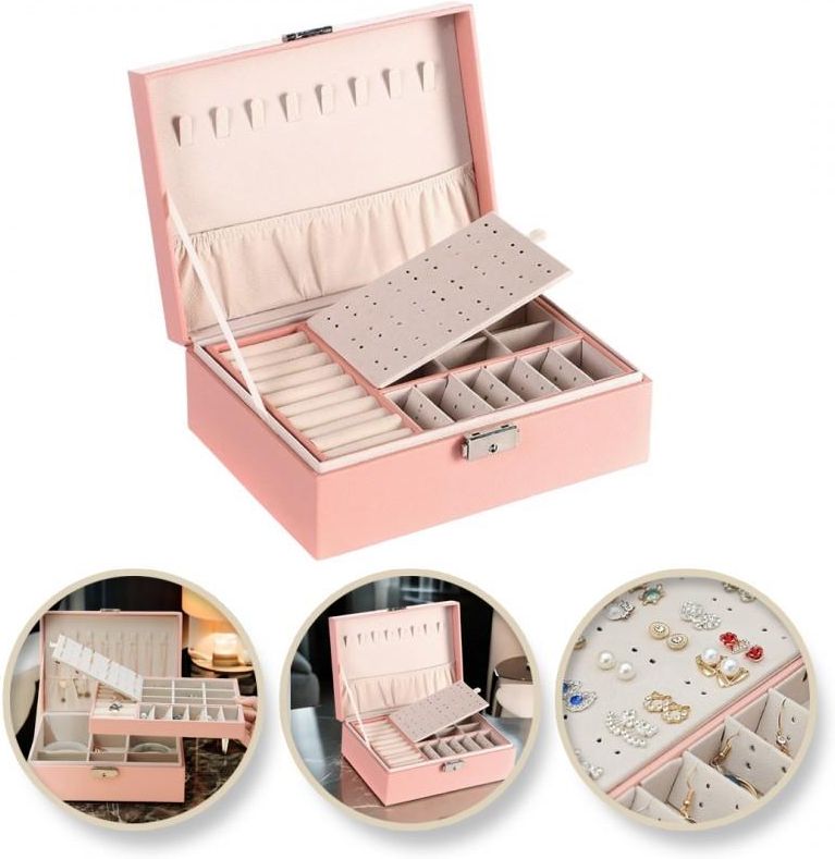 ELEGANCKA SZKATUŁKA NA BIŻUTERIĘBardzo elegancka i wspaniale prezentująca się szkatułka na biżuterięBardzo funkcjonalna z przegródkami oraz miejscami na naszyjniki, kolczyki oraz pierścionki.Dolny poziom idealny do przechowywania zegarków oraz większej biżuterii.Jest niezwykle praktyczna można w niej uporządkować i zabezpieczyć przed zniszczeniem bardzo dużą ilość biżuterii. Cechy produktu: - wysokiej jakości materiały użyte do produkcji to gwarancja jakości- bardzo funkcjonalny - pozwala wygodnie przechować dużą ilość biżuterii w jednym miejscu w sposób uporządkowany- posiada metalowy zamek- pokryta eleganckim materiałem - środek wypełniony miękkim welurowym materiałem Wymiary zewnętrzne:Wysokość - 8,5Szerokość - 23Głębokość - 17 Przegródki:8 haczyków na naszyjniki37 miejsc na kolczyki9 miejsc na pierścionki9 przegródek na drobiazgi 4,2 x 2,7 cmdolny poziom skrywa 6 przegródek Wymiary opakowania:24cm x 18cm x 9cmWaga:700g netto / 760g brutto