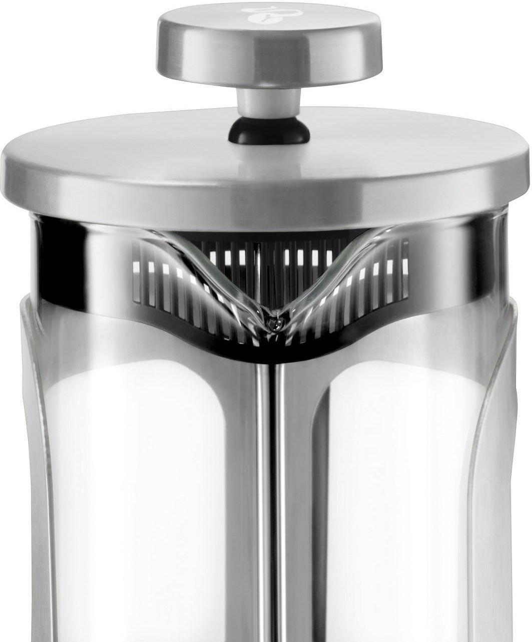 Zaparzacz do kawy french press 300 ml Tchibo (srebrny) Producent: Tchibo Typ urządzenia: zaparzacz french press Pojemność: 300 ml (około 2 filiżanki kawy) Materiał: borokrzemianowe szkło żaroodporne oraz stal nierdzewna Kolor wykończenia: srebrny Kolor ucha i wnętrza pokrywy: czarny Kawa z french …