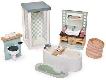Drewniane meble do domku dla lalek - łazienka, Tender Leaf ToysDrewniane akcesoria do domków dla lalek.W zestawie znajdziesz wszystkie potrzebne mebelki i akcesoria do urządzenia łazienki! Lalki będą zachwycone wanną, w której można przeczytać książkę czy obszernym prysznicem. Każdy mebelek został …