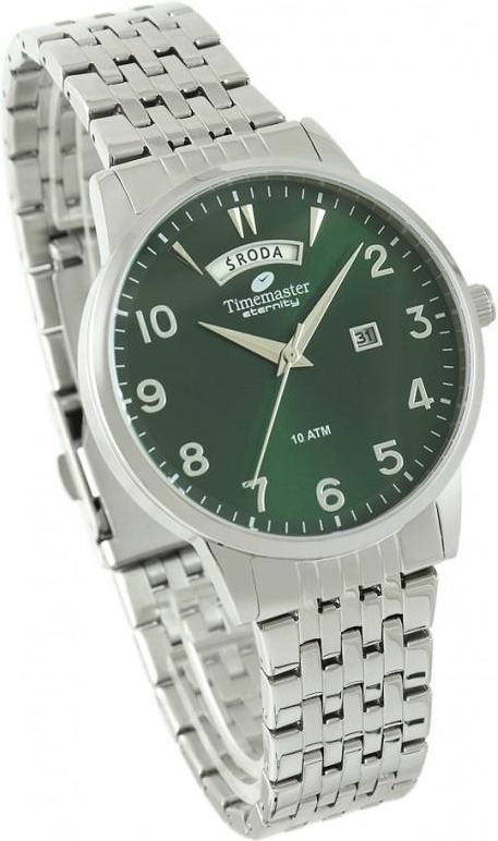 TIMEMASTER 275/06 – Elegancja i funkcjonalność w stalowym wydaniu z zieloną tarczą Zegarek męski TIMEMASTER 275/06 to doskonały wybór dla mężczyzn, którzy cenią połączenie klasycznego designu z nowoczesnymi funkcjami. Model ten łączy trwałość, precyzję i elegancję, stając się idealnym dodatkiem do codziennej garderoby, jak i na specjalne okazje. Zegarek napędza niezawodny mechanizm kwarcowy, zasilany baterią srebrową, zapewniający dokładność i długą żywotność. Solidna koperta ze stali nierdzewnej o średnicy 40 mm i grubości 10 mm jest wykończona w uniwersalnym, srebrnym kolorze. W zestawieniu z mineralnym szkłem o podwyższonej odporności na stłuczenia tworzy trwałą i elegancką konstrukcję. Na tle zielonej, analogowej tarczy wyraźnie prezentują się czarne indeksy oraz srebrne wskazówki, co gwarantuje czytelność nawet w słabszym świetle. Bransoleta wykonana ze stali nierdzewnej w kolorze srebrnym dopasowuje się do nadgarstka o maksymalnym obwodzie 22 cm, zapewniając komfort noszenia i trwałość. Model wyposażono w praktyczny datownik z dwoma wskaźnikami: dni miesiąca i dni tygodnia – co czyni zegarek nie tylko stylowym, ale i bardzo funkcjonalnym. Zegarek jest wodoszczelny do 100 metrów (10 ATM), dzięki czemu bez problemu wytrzyma kontakt z wodą podczas pływania czy kąpieli. W zestawie z zegarkiem otrzymujesz: ✅ oryginalny zegarek TIMEMASTER ✅ firmowe opakowanie TIMEMASTER ✅ kartę gwarancyjną producenta (3 lata) TIMEMASTER 275/06 – Zielona tarcza, srebrna stal, podwójny datownik 💎 Mechanizm: kwarcowy – precyzyjny i niezawodny 🔩 Koperta i bransoleta: stal nierdzewna, srebrna 📏 Koperta: 40 mm szerokości, 10 mm grubości 💧 Wodoszczelność 100M / 10 ATM – idealny do pływania 📅 Datownik – dzień miesiąca + dzień tygodnia 🪪 Gwarancja 3 lata od polskiego producenta 🎁 Zegarek + pudełko + karta gwarancyjna w komplecie 🇵🇱 Marka: TIMEMASTER / Polska Parametr Wartość Marka TIMEMASTER Model 275/06 Mechanizm Kwarcowy (bateria srebrowa) Szkło Mineralne Wodoszczelność 100M / 10 ATM Koperta – materiał Stal nierdzewna Koperta – kolor Srebrny Koperta – kształt Okrągły Koperta – szerokość 40 mm Koperta – grubość 10 mm Tarcza – kolor Zielony Tarcza – typ Wskazówkowy (analogowy) Indeksy Czarny Wskazówki Srebrne Pasek / bransoleta – typ Bransoleta Bransoleta – materiał Stal nierdzewna Bransoleta – kolor Srebrny Szerokość przy mocowaniu 20 mm Szerokość przy zapięciu 18 mm Maksymalny obwód 22 cm Funkcje dodatkowe Datownik – dzień miesiąca i tygodnia Gwarancja 36 miesięcy / 3 lata Kraj pochodzenia marki Polska