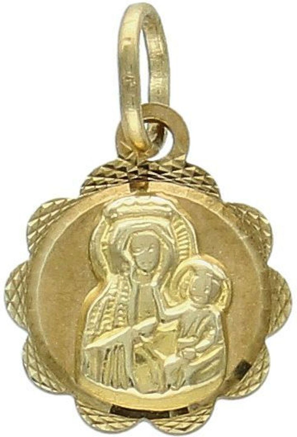 Złota zawieszka zdobiony medalik Matka Boska Częstochowska DIA-ZAW-1492-333. Piękny medalik o bogatej symbolice religijnej w kształcie przypominającym kwiatek. Religijną biżuterię wykonano z 8-karatowego żółtego złota, próby 333 kruszcu od wielu setek lat symbolizującego doskonałość i …