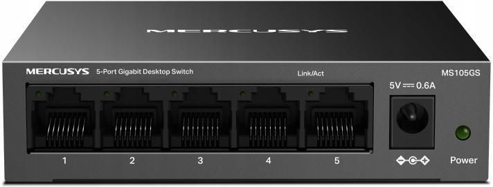 Mercusys MS105GS łącza sieciowe Nie zarządzany Gigabit Ethernet (10/100/1000) Czarny Mercusys MS105GS. Typ przełącznika: Nie zarządzany. Podstawowe przełączania Ethernet RJ-45 porty typ: Gigabit Ethernet (10/100/1000), Podstawowe przełączanie RJ-45 Liczba portów Ethernet: 5. Pełny dupleks. Wielkość tabeli adresów: 2000 wejścia, Przepustowość rutowania/przełączania: 10 Gbit/s. Standardy komunikacyjne: IEEE 802.3, IEEE 802.3ab, IEEE 802.3p, IEEE 802.3u, IEEE 802.3x. Napięcie wejściowe DC: 5 V. Złącze zasilania: DC-in jack. Montaż naścienny / rzutowanie na sufit Najważniejsze parametry techniczne Cechy zarządzania - Typ przełącznika: Nie zarządzany Światłowód - Odległość transmisji (maksymalna): 0,1 km Przesyłanie danych - Przepustowość rutowania/przełączania: 10 Gbit/s Przesyłanie danych - Wielkość tabeli adresów: 2000 wejścia Przesyłanie danych - Store-and-forward: Tak Przesyłanie danych - Zgodny z Jumbo Frames: Tak Przesyłanie danych - Rozszerzenie Jumbo Frames: 9000 Przesyłanie danych - Pamięci bufora pakietów: 0,125 MB Konstrukcja - Produkt stackowalny: Nie Konstrukcja - Kolor produktu: Czarny Konstrukcja - Materiał obudowy: Metal Konstrukcja - Diody LED: Tak Konstrukcja - Montaż naścienny / rzutowanie na sufit: Tak Wydajność - Bez wiatraka: Tak Porty i interfejsy - Podstawowe przełączanie RJ-45 Liczba portów Ethernet: 5 Porty i interfejsy - Obsługa PoE: Nie Porty i interfejsy - Podstawowe przełączania Ethernet RJ-45 porty typ: Gigabit Ethernet (10/100/1000) Porty i interfejsy - Złącze zasilania: DC-in jack Moc - Maksymalne zużycie mocy: 3,614 W Moc - Napięcie wejściowe AC: 220 V Moc - Częstotliwość wejściowa AC: 50/60 Hz Moc - Źródło zasilania: DC Moc - Prąd wejściowy: 0.6 A Moc - Napięcie wejściowe DC: 5 V Zawartość opakowania - Przewody: Prąd przemienny Sieć - Obsługa 10G: Nie Sieć - Standardy komunikacyjne: IEEE 802.3, IEEE 802.3ab, IEEE 802.3p, IEEE 802.3u, IEEE 802.3x Sieć - Pełny dupleks: Tak Sieć - Półdupleks: Tak Sieć - Podpora kontroli przepływu: Tak Sieć - Automatyczne MDI/MDI-X: Tak Sieć - Auto-Negocjacja: Tak Sieć - Wspierany auto-learning adresów MAC: Tak Sieć - Wspierany auto-aging adresów MAC: Tak Warunki pracy - Zakres wilgotności względnej: 10 - 90% Warunki pracy - Zakres temperatur (przechowywanie): -40 - 70 °C Warunki pracy - Zakres temperatur (eksploatacja): 0 - 40 °C Warunki pracy - Dopuszczalna wilgotność względna: 5 - 95% Warunki pracy - Emisja ciepła: 12,331 BTU/h Waga i rozmiary - Szerokość produktu: 99,8 mm Waga i rozmiary - Głębokość produktu: 98 mm Waga i rozmiary - Wysokość produktu: 25,1 mm Szczegóły Techniczne - Możliwości montowania w stelażu: Nie Zasilanie - Zasilacz dołączony: Tak Pozostałe funkcje - Skrócona instrukcja obsługi: Tak Pozostałe funkcje - Certyfikaty: CE, RoHS Klasyfikacja - Kod producenta: MS105GS Klasyfikacja - EAN: 6957939001315 Klasyfikacja - ID Produktu: 113710566