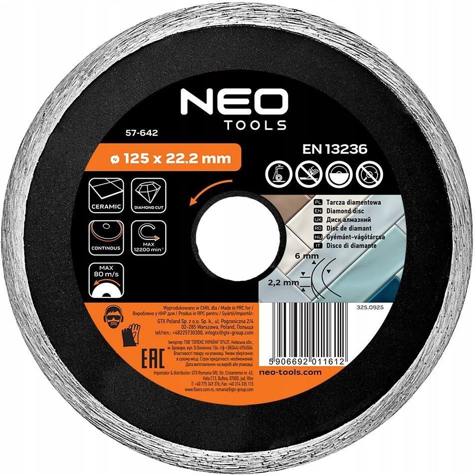 Solidna tarcza do cięcia NEO TOOLS 57-642 o średnicy 125 mm z otworem 22.2 mm od marki NEO TOOLS, polecana do przycinarek do glazury. Umożliwia wygodne cięcie na mokro, przy maksymalnej prędkości 12200 obrotów na minutę. Tarcza rekomendowana jest do pracy z twardymi oraz kruchymi materiałami; takimi jak ceramika. Za sprawą prasowanego na gorąco diamentowego segmentu o wysokości 6 mm i grubości 2.2 mm dobrze sprawdzi się na placach budowy.