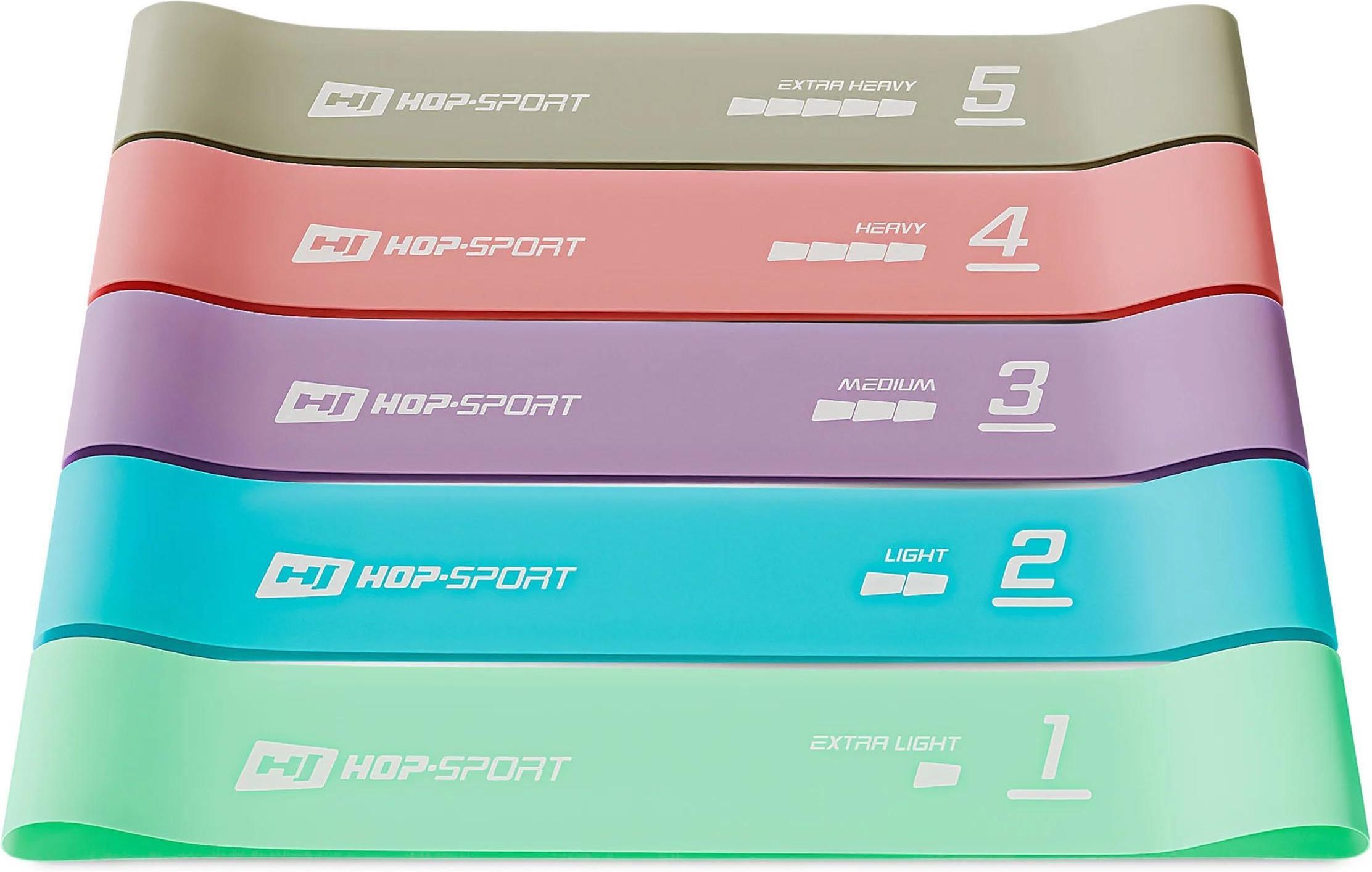 Gumy zestaw 5szt taśm hip-band oporowe do ćwiczeń rozciągania 30cm treningu Zestaw taśm oporowych 600x50 mm HS-L650RLL marki Hop-Sport to pięć taśm oporowych o różnym poziomie oporu, które z powodzeniem sprawdzą się podczas domowych ćwiczeń. Ich uniwersalne zastosowanie sprawia, że możesz je wykorzystać w różnych rodzajach treningu – od siłowego, przez fitness, po ćwiczenia rehabilitacyjne. Treningi z taśmami pomogą Ci wzmocnić mięśnie i stawy w całym ciele. Polecane są zarówno dla amatorów, jak i dla zaawansowanych. Zestaw HS-L650RLL zawiera pięć lateksowych taśm, które oferują różne poziomy oporu w szerokim zakresie od 2,5 do 18 kg. Ze względu na niewielkie rozmiary, gumy są bardzo łatwe w transporcie i przechowywaniu. Progresywne obciążenie Zasada działania taśm oporowych polega na tym, że im mocniej je rozciągasz, tym większy generują opór. Dzięki temu z łatwością dopasujesz obciążenie do etapu treningu, na którym właśnie się znajdujesz. Ćwiczenia z wykorzystaniem taśm oporowych Spacer z gumą miniband - jest to ćwiczenie, które angażuje do pracy przede wszystkim mięśnie pośladkowe średnie. Hip thrust z gumą miniband - ćwiczenie to angażuje do pracy przede wszystkim mięśnie pośladkowe większe. Wiosłowanie z taśmą power band - ćwiczenie to angażuje do pracy mięsień najszerszy grzbietu, mięsień obły większy, mięsień naramienny (jego tylną część), mięsień równoległoboczny i mięsień czworoboczny. Martwy ciąg z taśmą power band - ćwiczenie to angażuje do pracy tzw. tylną taśmę, czyli: mięsień dwugłowy uda, mięsień pośladkowy i mięśnie grzbietu. Wyciskanie taśmy power band nad głowę w pozycji stojącej - w tym ćwiczeniu do pracy zaangażujemy przede wszystkim mięsień naramienny i ramienny. Unoszenie ramion na boki z taśmą power band - w tym ćwiczeniu do pracy zaangażowane są głównie mięsień naramienny i ramienny. “Martwy robak” z taśmą mini band - w tym ćwiczeniu w szczególności pracuje mięsień prosty brzucha. ”Zegar” - podparcie przodem z taśmą mini band na nadgarstkach - ćwiczenie to angażuje do pracy taśmę przednią ciała i mięśnie głębokie brzucha. Każda z pięciu gum Zawartych w zestawie HS-L650RLL generuje inny zakres obciążenia – kolejno: 2,5-4,5 kg 4,5-7 kg 7-9 kg 11-14 kg 14-18 kg Wytrzymały lateks Zestaw taśm oporowych HS-L650RLL wykonany jest z wysokiej jakości 100% lateksu, charakteryzującego się dużą trwałością i wytrzymałością. Po rozciągnięciu wraca do pierwotnego kształtu, nie ulegają odkształceniom. Ponadto, nie wchłania wody, dzięki czemu jest bardzo łatwy w czyszczeniu, zapewniając Ci pełną higienę użytkowania. Lepsze efekty treningu Ćwiczenia z zastosowaniem taśm oporowych znacząco zwiększają rezultaty treningów. Pomogą Ci skutecznie wzmocnić mięśnie (w szczególności kończyn) i kształtować całą sylwetkę. Opór generowany przez taśmy sprawia, że Twoje mięśnie muszą wykonać jeszcze większą pracę niż podczas zwykłych ćwiczeń bez dodatkowego oporu. Taśmy mogą być stosowane także jako wsparcie w rehabilitacji po przebytych urazach kończyn - pozwalają zwiększać ruchomość stawów poprzez ich aktywizowanie i zmuszanie do pokonywania wzrastającego obciążenia. Dane techniczne Model: HS-L650RLL Materiał: lateks Obwód: 60 cm Szerokość: 5 cm