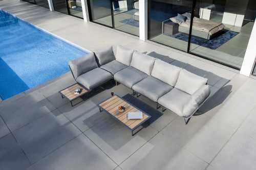 Alexander Rose - luksusowe meble do Twojego ogrodu lub patioWysokiej jakości luksusowe meble ogrodowe są podstawowymi produktami oferowanymi przez markę Alexander Rose, której korzenie sięgają 1994 roku oraz afrykańskiej Ghany - tam właśnie powstała pierwsza fabryka, której owoce pracy przeznaczone były na rynek brytyjski. Dziś produkty opatrzone tym brandem służą swoim różnorodnym nabywcom - centrom ogrodnicznym i spa, hotelom, restauracjom, klubom oraz domom opieki, a także indywidualnym odbiorcom ceniącym najwyższą jakość wykonania oraz estetykę łączącą nowoczesność z magią ręcznego rzemiosła. Wizją marki Alexander Rose pozostaje chęć bycia docenionym w Europie oraz na świecie za jakość oraz design mebli ogrodowych. Ponadto zarządzający brandem za cel swojej działalności postawili sobie wyróżnianie się doskonałą obsługą swoich klientów i działanie na rzecz ich maksymalnego zadowolenia - stąd produkty przez nich oferowane najczęściej posiadają wydłużoną gwarancję użyteczności - nawet do 10 lat. Warto również zwrócić uwagę, że surowiec do produkcji drewnianych mebli ogrodowych pozyskiwany jest z odpowiednio zarządzanych lasów tak, by zminimalizować wpływ jego pozyskania na środowisko. Cały proces produkcji został unowocześniony w celu zmniejszenia śladu węglowego, a ilość wykorzystywanych niebezpiecznych dla środowiska materiałów została maksymalnie ograniczona. Długi możliwy czas użytkowania oferowanych produktów znacząco również rzutuje na ochronę środowiska naturalnego. Kolekcja BEACH LOUNGEKolekcja BEACH LOUNGE wyróżnia są niezwykle wygodnymi, wodoodpornymi poduszkami w różnych kolorach, które umożliwiają użytkowanie mebli przez 365 dni w roku. Komfort, wszechstronność i funkcjonalność tej kolekcji sprawia, że BEACH LOUNGE jest idealna do nowoczesnego życia na świeżym powietrzu. Jeżeli marzysz o odpoczynku po ciężkim dniu, to ta kolekcja będzie dla Ciebie idealna. Kolory poduszek Kolor BEŻ Kolor NIEBIESKI Kolor POMARAŃCZOWY Kolor SZARY Kolor ZIELONY Podstawowy skład kompletu do wyboru: jeden stolik prostokątny z blatem z drewna w kolorze DĄB (standardowy - widoczny na zdjęciu); jeden stolik prostokątny z blatem z aluminium w kolorze KAMIEŃ; do wyboru: jeden stolik kwadratowy z blatem z drewna w kolorze DĄB (standardowy - widoczny na zdjęciu); jeden stolik kwadratowy z blatem z aluminium w kolorze KAMIEŃ; trzy elementy środkowe z poduszkami w kolorze BEŻ, NIEBIESKI, POMARAŃCZOWY, SZARY lub ZIELONY; dwa narożniki z poduszkami w kolorze BEŻ, NIEBIESKI, POMARAŃCZOWY, SZARY lub ZIELONY; na specjalne życzenie możliwe dopasowanie dodatkowego pokrowca w kolorze ZIELONY. Skład kompletu można dowolnie konfigurować za pomocą produktów z kolekcji BEACH LOUNGE. Zalety kompletu niezwykła wygoda poduszek; odporność na działanie promieni UV; odporność na warunki atmosferyczne; niepowtarzalne wzornictwo; wzmocnione konstrukcje stelaży; ramy aluminiowe malowane proszkowo; dodatkowe wzmocnienia zapewniają długotrwałą wygodę i komfort użytkowania. Materiały i wykonanieKomplet mebli ogrodowych BEACH LOUNGE marki Alexander Rose jest wykonany z najwyższej jakości aluminium w kolorze KRZEMIEŃ. lekkie stelaże są wykonane z aluminium malowanego proszkowo; dzięki zastosowaniu materiału olefinowego uzyskano doskonałą jakość oraz wytrzymałość; w komplecie znajdują się poduszki, które wytworzono z wodoodpornego materiału. Zapewniają one komfortowe użytkowanie kompletu; pokrowce na poduszki są zaimpregnowane, dzięki czemu są odporne na warunki atmosferyczne oraz poplamienia, dzięki czemu przypadkowo wylane napoje nie stanowią już żadnego problemu.