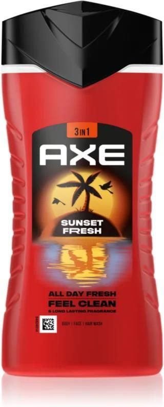Axe Sunset Fresh Shower Gel, 250 ml, Żele pod prysznic i mydła dla mężczyzn, Żel pod prysznic Axe Sunset Fresh Shower Gel zmieni konieczną codzienną higienę w wyjątkowe odświeżające doznanie. Właściwości: łagodnie myje skórę całego ciała można używać do ciała i włosów zmiękcza i nawilża po użyciu zapewni uczucie świeżości i energii pozostawia skórę aksamitnie delikatną i miękką Sposób użycia: Nanieś preparat na wilgotną skórę i zmyj wszystkie zanieczyszczenia. Dokładnie spłucz.