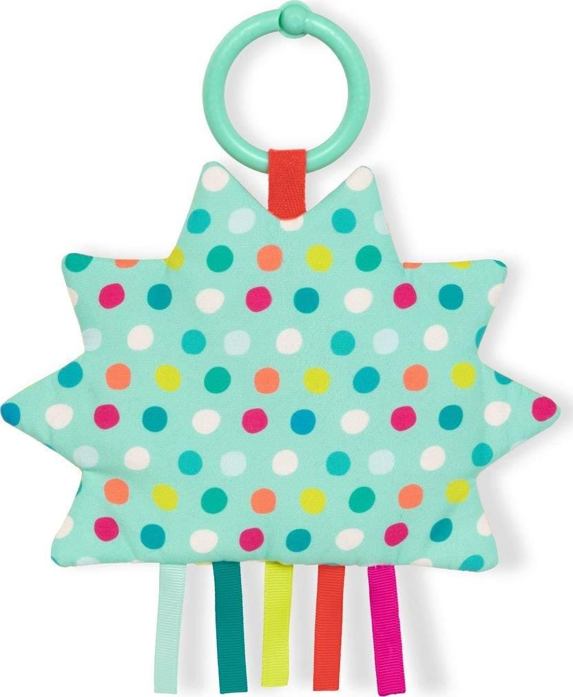 Szeleszczące Słoneczko Przywieszka Sensoryczna Stymulująca sensorycznie zabawka dla najmłodszych, z opcją przywieszenia do wózka, maty, fotelika, torby itp.. Pobudza zmysł wzroku, słuchu i dotyku. Zróżnicowane bodźce: rozmaite faktury materiału szeleszczące wypełnienie różne barwy i wzory sprzyjają integracji sensorycznej. Kolorowe tasiemki stymulują chwyt, co przyczynia się do budowania koordynacji ruchowo-wzrokowej. Rewers pokryty wzorem w urocze wielobarwne grochy. Wygodny pierścień umożliwia przypięcie wesołej chmurki do łóżeczka czy wózka. Dostępny również bliźniaczy model – szeleszcząca Chmurka. Zabawka może być używana przez dzieci już od urodzenia. Łatwa w utrzymaniu w czystości – można prać w pralce, w programie delikatnym temp. do 30°C (zalecane zastosowanie siateczki ochronnej). Możliwe różnice w kolorach i szczegółach względem tych widocznych na zdjęciach. Wymiary słoneczko z pierścieniem: ok. 23cm x 20cm x 1,5cm zabawka z opakowaniem: ok. 23cm x 22cm x 2cm