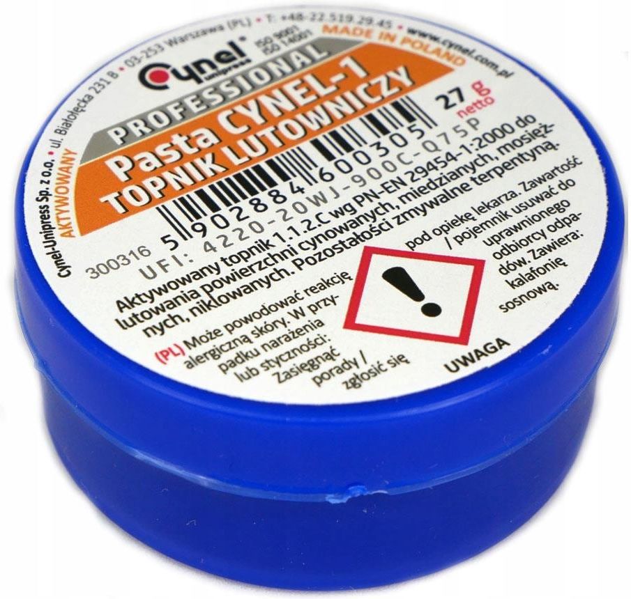 Pasta CYNEL-1 topnik lutowniczy 27g Pasta lutownicza Cynel-1 jest produkowana na bazie kalafonii z aktywatorami organicznymi. Zawiera aktywny topnik 1.1.2.C wg PN EN 29454. Szczególnie polecana do lutowania silnie zabrudzonych lub utlenionych powierzchni. Doskonale nadaje się do lutowania powierzchni:cynowanych, miedzianych, mosiężnych, niklowanych, pobielania końcówek przewodów itp. Dane techniczne pasta CYNEL-1 produkcji Cynel ułatwia lutowanie elementów cynowanych i miedzianych: kabli, przewodów, elementów elektronicznych, płytek drukowanych pcb opakowanie: 27g metalowa puszka Aktywowany topnik do lutowania powierzchni cynowanych, miedzianych, mosiężnych, niklowanych. Pozostałości zmywane terpentyną