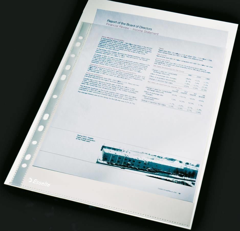 Koszulki krystaliczne A4 Esselte podlegająca recyklingowi krystaliczna folia PP o grubości 0,105 mm, copysafe otwierane od góry, co zapewnia łatwe wyciąganie dokumentów, bez konieczności wyjmowania ich z segregatora 11 uniwersalnych otworów na pasku umożliwiających wpięcie w każdy segregator format A4