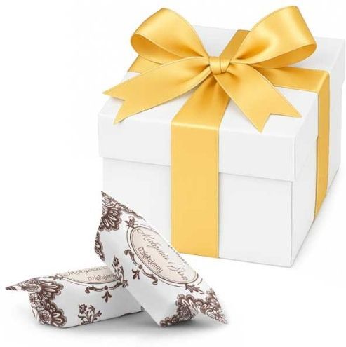 Personalizowane krówki na ślub w białym pudełku – eleganckie podziękowania dla gości Szukasz stylowego sposobu na podziękowanie gościom weselnym? Postaw na krówki ślubne z personalizacją zamknięte w białym pudełku z satynową kokardą. Łączą klasyczny smak, wysoką estetykę oraz osobisty charakter – idealne na stoły weselne, do woreczków prezentowych i dla najbliższych. Zestaw zawiera 15 szt. ręcznie zawijanych krówek mlecznych z personalizacją (imiona Pary Młodej, data, dedykacja/cytat), eleganckie białe pudełko 12 × 12 × 7 cm z błyszczącego kartonu 400 g, satynową kokardę do wyboru: złota, biała, pudrowo-różowa, niebieska, czarna, projekt etykiety od grafika – w cenie produktu, zgodny z motywem wesela. Dlaczego warto Gotowe do wręczenia – bez dodatkowego pakowania, Pełna personalizacja – imiona, data ślubu, dedykacja lub cytat, Klasyczna receptura – mleczne krówki „jak z dzieciństwa”, Trwały nadruk full color – odporny na ścieranie i wilgoć, Uniwersalne zastosowanie – na stoły weselne, dla rodziców, świadków i wszystkich gości. Dla kogo Dla rodziców i świadków – elegancka pamiątka z uroczystości, Dla rodziny i przyjaciół – słodki gest wdzięczności za obecność, Dla wszystkich gości weselnych – stylowe i praktyczne podziękowanie. Jak zamówić Po zakupie wyślemy link do formularza personalizacji. Wpisz imiona, datę ślubu, dedykację, wybierz wzór etykiet i kolor kokardy. Otrzymasz wizualizację do akceptacji – możesz wprowadzić poprawki przed drukiem. Skład krówek Cukier, syrop glukozowy z pszenicy, odtłuszczone mleko (12%), masło, śmietanka w proszku, tłuszcz roślinny, kwas cytrynowy, sól, aromat. Bezglutenowe • Bez oleju palmowego • Produkt polski