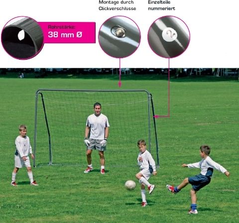 Duża składana BRAMKA PIŁKARSKA XXL MEGA GOAL z siatką - 300cm x 205cm Średnica rurek metalowych 38mm!!! Dane techniczne wymiary bramki 300 x 205 x 120 cm, średnica rurek stalowych 38 mm!!! odporna na warunki atmosferyczne- stal malowana proszkowo kolor czarny nylonowa siatka bramkarska 5 śledzi mocujących bramkę do podłoża szybki montaż dzięki systemowi zatrzasków (wszystkie rurki ponumerowane) waga 15 kg produkt niemieckiej firmy Best Sporting znak CE Bramka biało-czerwona widoczna na zdjęciu nie jest przedmiotem tej oferty - została przedstawiona jedynie dla porównania. Bramka nowa w oryginalnym opakowaniu