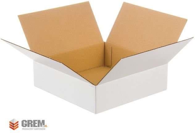 Komplet 20 szt. białych pudeł kartonowych klapowych o wymiarach zew. 300x300x100 mm (dł/szer/wys). Opakowania wykonane są z trzywarstwowej tektury falistej (fala B) o gramaturze 365 g/m2.