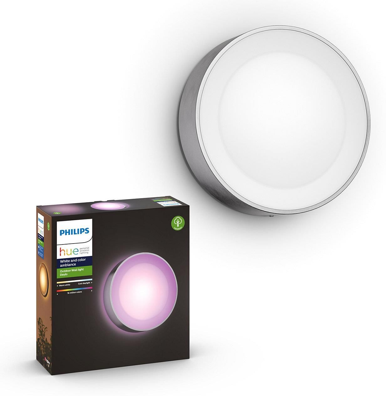 Philips HUE Daylo stal nierdzewna 1746547P7 Czarny okrągły kinkiet Daylo rozsyła krąg światła od fasady budynku, świecąc kolorowym światłem w jednym z 16 milionów kolorów. Ta lampa zewnętrzna pozwala uzyskać miękkie, kierowane na zewnątrz efekty świetlne, jak również delikatne podświetlenie za …