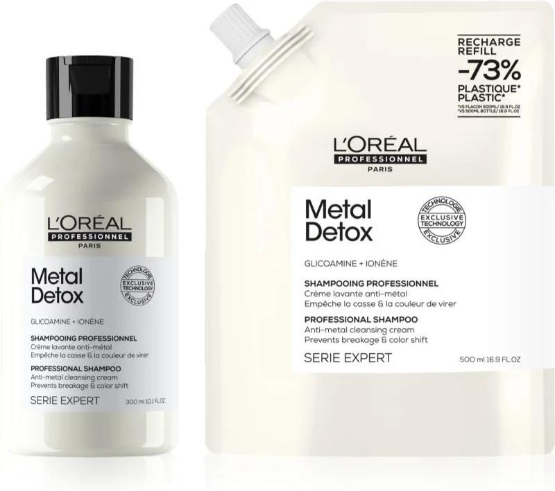 L’Oréal Professionnel Serie Expert Absolut Repair Molecular, , Zestawy kosmetyków dla kobiet, Zawartość zestawu: L’Oréal Professionnel Serie Expert Metal Detox szampon głęboko oczyszczający do włosów farbowanych i zniszczonych 300 ml L’Oréal Professionnel Serie Expert Metal Detox szampon głęboko oczyszczający do włosów farbowanych i zniszczonych 500 ml Właściwości: zestaw w okazyjnej cenie Skład: bez siarczanów