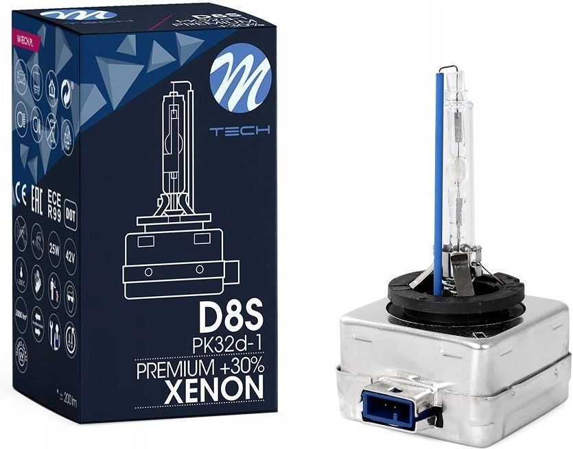 ŻARNIK Xenon D8S PREMIUM 6000K +30% Cena dot. 1 szt. kod: ZMD8S6 Parametry techniczne Moc znamionowa: 35 W Mały pobór prądu: 3,2A (w czasie pracy) max. 10A (rozruch) Napięcie znamionowe: 42 V Bardzo szeroki zakres temperatur pracy: -40 +115'C Wsparcie gwarancyjne - 24 MIESIĄCE HOMOLOGACJA: TAK Opis przedmiotu M-Tech PREMIUM D8S +30% Bardzo ważnym parametrem każdego żarnika jest odpowiednia mieszanka gazu xenonowego. Odpowiednio dobrana definiuje nie tylko kolor światła jakie wydaje żarnik, ale także jego jakość i żywotność. Pasują w miejsce mocowania standardowych żarówek, posiadają odpowiednie wtyczki (nie trzeba nic lutować ani przecinać) Żarówki xenon emitują 4 razy więcej światła niż zwykłe halogeny. Żarniki xenonowe marki M-TECH to klasyczne żarniki, które współpracują z każdą przetwornicą stosowaną w zestawach xenonowych. Żarniki wyposażone są w hermetyczne złącza oraz zintegrowane przewody zasilające. Bardzo ważnym parametrem każdego żarnika jest odpowiednia mieszanka gazu xenonowego. Odpowiednio dobrana definiuje nie tylko kolor światła jakie wydaje żarnik, ale także jego jakość i żywotność. Ze względu na różnorodne etapy żywotności żarówki polecamy wymianę dwóch żarówek, z racji tego że każda żarówka potrzebuje 20-40 godzin na pełne rozświecenie. Nowo zamontowana żarówka zanim się w pełni rozświeci do koloru niebieskiego świeci na kolor biały. Dlatego gdy wymieniamy tylko jedną żarówkę barwa światła różnić się będzie w stosunku do żarówki używanej.