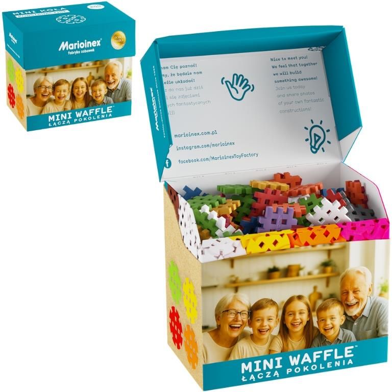 {col/50/} Klocki Mini Waffle Zestaw Seniora Producent: Marioinex Ilość elementów: 200 Zawartość: 50 mini kół i 150 mini waffli Rekomendowany wiek: 6+ (dla dzieci, dorosłych i seniorów) {col/50/} {col/50/} {col/50/} Klocki, które budują konstrukcje i więzi W świecie, w którym tempo życia często oddala pokolenia, Marioinex stworzył coś wyjątkowego – Mini Waffle Łączą Pokolenia, zestaw klocków, który daje radość, rozwija sprawność i… zbliża ludzi. To nie są zwykłe klocki. To narzędzie wspólnego spędzania czasu, które łączy dzieci, rodziców i dziadków przy jednej zabawie – pełnej śmiechu, emocji i wspólnego tworzenia. Te miękkie, kolorowe elementy pomagają ćwiczyć sprawność dłoni, koordynację ruchową i koncentrację, a przy tym w naturalny sposób budują relacje między pokoleniami. Wspólne układanie to nie tylko zabawa – to terapia, rozwój i czysta radość bycia razem. {col/50/} Z myślą o seniorach – wsparcie dla dłoni, umysłu i serca Klocki Mini Waffle Łączą Pokolenia zostały zaprojektowane z ogromną troską o potrzeby osób starszych. Ich miękka, elastyczna struktura sprawia, że są wygodne do chwytania nawet dla osób z ograniczoną mobilnością dłoni. Dzięki przyjemnej fakturze i odpowiedniemu rozmiarowi elementów, zabawa staje się bezpieczna i komfortowa, a jednocześnie wspiera rehabilitację ruchową, trening pamięci i koncentracji. To świetne narzędzie do terapii zajęciowej, ćwiczeń motorycznych i codziennej aktywizacji. Pomaga nie tylko rozwijać sprawność manualną, ale również utrzymać pozytywny nastrój i dobre samopoczucie psychiczne. {col/50/} {col/50/} {col/50/} Wspólna zabawa, która zbliża pokolenia Nic nie daje takiej radości, jak wspólne budowanie z wnukami! Zestaw Mini Waffle Łączą Pokolenia to doskonała okazja, by dziadkowie i dzieci mogli spędzać czas razem – tworząc budowle, wymyślając historie i rozwijając wyobraźnię. Każdy wspólny projekt to sposób na rozmowę, śmiech i tworzenie pięknych wspomnień. Zestaw rozwija kreatywność u dzieci i podtrzymuje aktywność u dorosłych. To przykład, że zabawa naprawdę nie ma wieku – a łączenie elementów staje się metaforą łączenia serc. {col/50/} Bezpieczeństwo i jakość, którym można zaufać Marioinex od lat znany jest z tworzenia produktów bezpiecznych, trwałych i przyjaznych środowisku. Klocki Mini Waffle powstają w Polsce, z wysokiej jakości, nietoksycznego materiału, który jest miękki, elastyczny i bezpieczny dla skóry. Zestaw jest w pełni zgodny z europejskimi normami bezpieczeństwa, a jego kolory i kształty zostały dobrane tak, by stymulować zmysły i wspierać rozwój. {col/50/} {col/50/} {col/50/} Najważniejsze zalety: