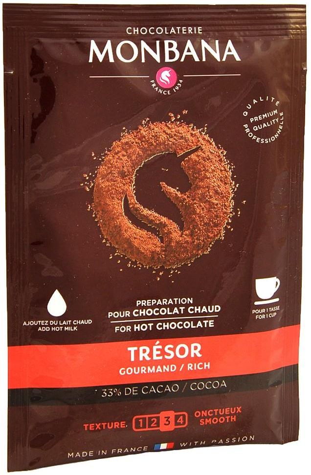 Monbana Tresor Chocolate - saszetka 25g Wysokiej jakości czekolada w proszku, zawiera aż 33% kakao! Wystarczy zalać gorącym mlekiem i dokładnie wymieszać. Monbana specjalizuje się przede wszystkim w produkcji gorącej czekolady w proszku o różnych, niepowtarzalnych smakach. Gorąca czekolada, o aksamitnej i puszystej konsystencji to idealny sposób na poprawę nastroju i udany dzień. Spróbuj tej niesamowitej przyjemności i delektuj się niepowtarzalnym smakiem, aksamitnej czekolady Monbana.