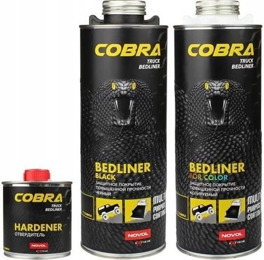 COBRA Truck Bedliner to powłoka ochronna z efektem strukturalnym na bazie żywic poliuretanowych 2K. Charakteryzuje się bardzo wysoką wytrzymałością mechaniczną i jest odporna na zarysowania. Zabezpiecza przed wpływem czynników atmosferycznych, benzyną, olejami, wodą i solą. Posiada właściwości dźwiękochłonne i wygłuszające. Struktura powierzchni nadaje efekt antypoślizgowy. W wersji standardowej występuje w kolorze czarnym, w wersji do barwienia pozwala na uzyskanie dowolnego koloru przez dodanie 10-15% farby akrylowej lub bazowej (zalecamy użycie SPECTRAL 2K lub SPECTRAL BASE). ! Utwardzacz dostępny na osobnej aukcji ! Korzyści wynikające z zastosowania COBRA Truck Bedliner: najwyższy poziom ochrony powierzchnia odporna na plamy i zarysowania na każde warunki atmosferyczne: wilgoć, wysokie temperatury, mrozy, promieniowanie UV, słoną wodę łatwa i szybka aplikacja „ADD – SHAKE – SPRAY” możliwość wyboru grubości struktury wygłuszenie poprawiające komfort jazdy możliwość zastosowania na różnych podłożach doskonały efekt wizualny COBRA pozwala na uzyskanie różnej struktury w zależności od dyszy i stopnia rozcieńczenia: gruba struktura – regulowana ciśnieniem i odległością pistoletu od powierzchni podczas aplikacji za pomocą pistoletu UBS, średnia struktura - przy dodaniu 0-5% rozcieńczalnika i aplikacji za pomocą pistoletu konwencjonalnego z dyszą Ø 2,5mm; drobna struktura (doskonale imitujaca tworzywo sztuczne) – przy dodaniu 25-30% rozcieńczalnika i aplikacji za pomocą pistoletu konwencjonalnego z dyszą Ø1,4-1,8mm. Możliwa jest też aplikacja za pomocą wałka lub pędzla. Zalecenia odnośnie przygotowania podłoża: odtłuszczenie za pomocą zmywacza antysilikonowego, przeszlifowanie powierzchni za pomocą papieru ściernego o gradacji dobranej do podłoża: od P120 do P180, dokładne odmuchanie powierzchni dla usunięcia luźnych cząsteczek, ponowne odtłuszczenie za pomocą zmywacza antysilikonowego, zamaskowanie wszystkich powierzchni, które nie mają być pokryte powłoką ochronną (w tym: otwory gwintowe, elementy niedemontowalne) za pomocą taśmy lakierniczej oraz papieru lub folii, aplikacja warstwy zabezpieczenia antykorozyjnego (podkładu wytrawiającego 2K lub epoksydowego 2K); nie rekomenduje się nakładania powłoki ochronnej na „goły metal”, w przypadku tworzyw sztucznych lub słabo zmatowionych powierzchni zaleca się użycie środka zwiększającego przyczepność, w przypadku niepewnego podłoża wykonać tzw. test rozcieńczalnikowy – jeżeli powłoka rozpuszcza się po przetarciu szmatką z rozcieńczalnikiem (produkt 1K) należy ją usunąć, po prawidłowym utwardzeniu i przygotowaniu powłok zabezpieczających antykorozyjnie (matowanie, odmuchanie, odtłuszczanie wg zaleceń) nakładać powłokę ochronną COBRA zgodnie z informacjami umieszczonymi w karcie technicznej.