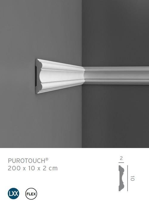 Kolekcja LUXXUS to szeroki wybór luksusowych, lekkich i łatwych w montażu listew gzymsowych, oświetleniowych, profili i paneli ściennych, rozet, obudowy kominków, obudowy drzwi, obudowy bibliotek oraz akcesoriów dekoracyjnych wykonanych z wysokiej gęstości pianki poliuretanowej POROTOUCH, pokrytej folią w kolorze białym. Dodatkowo sztukateria zabezpieczona została farbą podkładową. Po zamontowaniu wymagane jest pomalowanie elementów dekoracyjnych farbami nie zawierającymi rozpuszczalnków. Listwy sufitowe oraz profile ścienne występuje również w wersji flex (F)– listwy gięte, które można wyginać w płaszczyżnie poziomej na zewnątrz i do wewnątrz, co pozwala na ich montaż wokół słupa lub innej krzywiźnie ścian. Wymiary: 2 x 10 x 200 cm Profil dekoracyjny w wersji giętej: P8040F