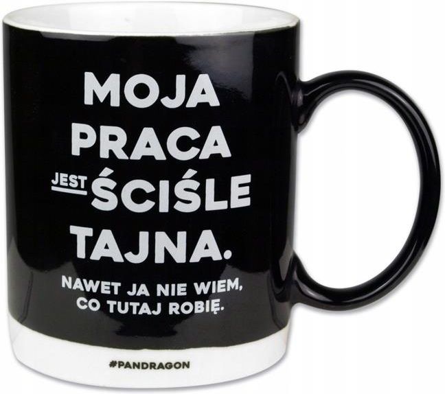 KUBEK MAN AT WORK ŚCIŚLE TAJNA PREZENT UPOMINEK ŚMIESZNY GADŻET PRACA DOWCIP PD1062 Kolekcja "Man at work" to dowcipna propozycja na kubek dla pracowników sektorów przeróżnych! Pamiętajcie - w każdej pracy liczy się poczucie humoru! Opakowanie: nie Mycie w zmywarce: tak Kuchenka mikrofalowa: tak Rozjaśnij dzień w biurze lub w domowym zaciszu z naszym Kubkiem "Man at Work" MOJA PRACA JEST ŚCIŚLE TAJNA. NAWET JA NIE WIEM CO TUTAJ ROBIĄ . To zabawny, praktyczny gadżet idealny jako prezent dla współpracowników, szefa, czy każdego, kto potrzebuje humorystycznego akcentu w pracy. Kubek z napisem " MOJA PRACA JEST ŚCIŚLE TAJNA. NAWET JA NIE WIEM CO TUTAJ ROBIĄ " to trafny komentarz do codziennych zadań i idealny sposób na rozładowanie stresu w pracy. Kluczowe cechy produktu Pojemność 350 ml : Kubek o idealnej wielkości na poranną kawę lub herbatę, idealny do biura czy domu. Śmieszny nadruk : Hasło MOJA PRACA JEST ŚCIŚLE TAJNA. NAWET JA NIE WIEM CO TUTAJ ROBIĄ doskonale oddaje charakter szybkiego trybu pracy, podkreślając humorystyczny dystans do codziennych obowiązków. Wysoka jakość : Kubek wykonany z trwałej ceramiki, odpornej na zarysowania i odpowiedniej do mycia w zmywarce oraz użytkowania w mikrofalówce. Dlaczego warto wybrać Kubek "Man at Work" MOJA PRACA JEST ŚCIŚLE TAJNA. NAWET JA NIE WIEM CO TUTAJ ROBIĄ? Świetny prezent : Idealny upominek na urodziny, imieniny, święta czy jako humorystyczny gadżet do biura dla współpracowników. Dodaje humoru do pracy : Kubek z zabawnym napisem poprawi humor i wprowadzi odrobinę rozrywki do każdego biura. Uniwersalny design : Doskonale nadaje się zarówno do użytku domowego, jak i w miejscu pracy, gdzie wszyscy potrzebują odrobiny luzu.