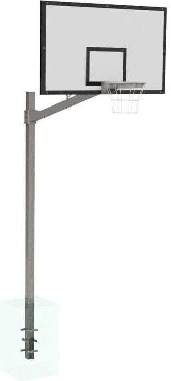 Jednosłupowa konstrukcja do koszykówki Strong z tablicą 105x180 lub 90x120 cm, na słupie 100x100x4 mm, instalowana na stałe Konstrukcja do koszykówki jednosłupowa z tablicą o wymiarach 105x180 cm lub 90x120 cm, wysięg 1,2 - 1,65 m, instalowana na stałe w podłożu, przeznaczona do gry na otwartej przestrzeni (place zabaw, boiska szkolne). Słup główny, wykonany z profilu o przekroju 100x100x4 mm, jest osadzony na stałe w betonowym fundamencie. Wysięgnik z profilu 90x90x3 mm mocowany jest do słupa na obejmie ze specjalnie giętych blach o grubościach 8 mm i sześciu śrubach M12x45 oraz z blachą do zamocowania tablicy o grubości 12 mm. Specjalne otwory pod śruby stożkowe ustalające w blasze wysięgnika umożliwiają łatwy i bezproblemowy montaż tablicy. Uniwersalne zastrzały z regulacją pasują do różnego typu tablic (epoksydowych i kratowych, a także ze szkła akrylowego lub hartowanego). Całość konstrukcji zabezpieczona antykorozyjnie poprzez cynkowanie ogniowe. Jeżeli chcesz złożyć kompletny zestaw do koszykówki na boiska zewnętrzne potrzebujesz jeszcze : Tablice do koszykówki, jeden model podany niżej w zależności od potrzeb : Tablica do koszykówki 120x90 Tablica do koszykówki profesjonalna 105 x 180 Tablica stalowa kratkowana 105 x 180 Tablica stalowa kratkowana 90 x 120 Obręcz na boiska zewnętrze : Obręcz do koszykówki Ewentualnie mechanizm regulacji wysokości : Regulacja wysokości do tablic 90 x 120 Regulacja wysokosci do tablic 105 x 180