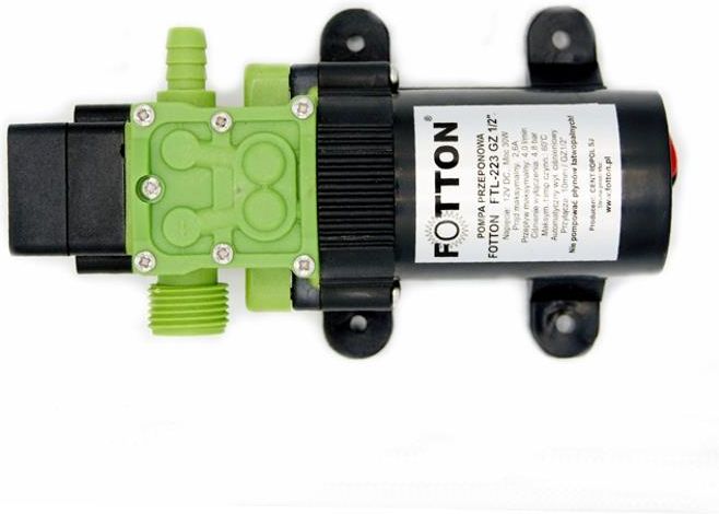 Pompka wody przeponowa FOTTON FTL223F 1/2" GZ 12V DC 4,8 bara 4,0l/min FOTTON to najbardziej znana Polska marka wysokiej jakości produktów związanych z energią odnawialną i systemami pompowymi.Pompa tłoczna wyposażonaw automatyczny wyłącznik ciśnieniowy 4,8 bara. Spośród wielu zastosowań polecić ją można szczególnie do napełniania i uzupełniania płynu solarnego w instalacjach solarnych, kempingów, łodzi, domków letniskowych itp., gdzie doskonale spisuje się do zasilania instalacji wodnych, sterowana otwarciem zaworu! Drugi obszar stosowania to opryski w rolnictwie głównie w opryskiwaczach przenośnych lub montowanych na różnorakim sprzęcie rolniczym. Najważniejsze zalety: - Kompaktowa budowa, - Wbudowany automatyczny wyłącznik - możliwość sterowania otwarciem kranu - Posiada możliwość zasysania cieczy więc może być montowana ponad zbiornikiem - Uszczelnienie silnika i wyłącznika (nie może pracować jednak jako pompa zanurzeniowa!) - Możliwość suchego startu, - Wbudowane zabezpieczenie termiczne, - Pompowany płyn nie ma kontaktu z metalem Parametry: *Napięcie: standard 12VDC *Prąd nominalny przy 0,7 bara 2,5A *Wolny przepływ: 4,0l/min *Waga netto 0,68kg *Ciśnienie wyłączenia : 4,0 bar *Ciśnienie maksymalne 4,8bar *Przyłącza: pod wąż 10mm(zasysanie) x 1/2" GZ (tłoczenie) *Sterowanie: wbudowany automatyczny wyłącznik ciśnieniowy *Maksymalna temperatura cieczy 60st.C Główne obszary zastosowań:- napełnianie i uzupełnianie instalacji solarnych - przepompowywanie wody i płynów - małe instalacje wodne w kempingach, łodziach, domkach letniskowych zasilanych niskim napięciem 12VDC - toalety samochodowe - współpraca z zasilaniem autonomicznym, - sprzęt czyszczący, systemy chłodzące - urządzenia filtrujące, urządzenia napełniające, przemysł chemiczny - przepompowywanie wody do oczek wodnych, fontann i innych dekoracji ogrodowych - opryski w rolnictwie, opryskiwacze przenośne, - zasilanie instalacji podlewających, tryskających itd...Pompa jak wszystkie pompy przeponowe przeznaczona jest do pracy cyklicznej. W celu zapewnienia prawidłowego działania i ochrony pompy szczególnie w przypadku poboru wody z otwartego źródła tj.staw, studnia, oczko wodne, zbiorniki z deszczówką itp. zachęcamy do zakupu filtra ssącego - AKCESORIA powyżejW przypadku instalacji 230V AC proponujemy zastosowanie zasilacza typu desktop 5A 12V DC - AKCESORIAPodstawowe materiały z których wykonano pompę:Głowica - PA66Zawory - EPDM / VITONMembrana - TPV58AŚruby - stal nierdzewnaWażna uwaga ! Membrana:Specjalny materiał membrany zastosowany wyłącznie w pompach FOTTON - TPV58A elastomer sieciowany to wyjątkowy materiał charakteryzujący się bardzo dobrą odpornością termiczną, odpornością na UV, na chemikalia, oleje, rozpuszczalniki i ozon w długim interwale czasowym. Odporność ww tworzyw na konkretny związek chemiczny lub kombinacje związków należy sprawdzić u specjalisty przed zastosowaniem.Głowica pompy:PA66 - Poliamid 66 ma bardzo wysoką wytrzymałość mechaniczną, sztywność, odporność cieplną, chemiczną, materiał ten może również pracować w trwałych temperaturach użytkowych do 100C. (cała pompa do 60C)- wysokie własności wytrzymałościowe w szerokim zakresie temperatur- dobra wytrzymałość mechaniczna- obojętność fizjologiczna (możliwość stosowania w bezpośrednim kontakcie z produktami żywnościowymi)- wysoka odporność chemiczna na działanie olejów oraz tłuszczów- słaba odporność chemiczna na działanie stężonych kwasów, dobra odporność na działanie mało stężonych kwasów i zasad. Pompa objęta pełnym serwisem gwarancyjnym i pogwarancyjnym. Gwarancja 12 m-cy. Zapraszamy