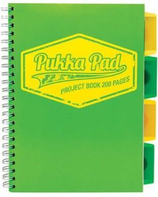 Kołozeszyt w kratkę, posiada podwójną spiralę Różnokolorowe przekładki z pojemnymi kieszeniami można dowolnie przestawiać - 4 przekładki Perforacja ułatwia wyrywanie stron Przezroczysta, zewnętrzna okładka wykonana z polipropylenu Format - B5 Ilość stron - 200 Gramatura papieru - 80g Producent - Pukka Pad Kolor neonowy zielony Nr oferty xSale PUK010