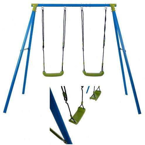 Huśtawka dziecięca Sandora XNS003 mocny stabilny stelaż, podwójna Wysokiej jakości, stabilna rama huśtawki z dwoma miejscami do huśtania do ustawienia na zewnątrz. Dane techniczne huśtawki XNS003: huśtawka o mocnej stabilnej konstrukcji - rury stalowe ocynkowane i malowane proszkowo w zestawie znajdują się 4 kotwy gruntowe 2x huśtawka dziecięca (udźwig 50 kg każde miejsce) zalecenie wiekowe: 3-12 lat maksymalna waga użytkownika: 50 kg na stronę całkowite obciążenie: 100 kg przy równoczesnym użytkowaniu lub 50 kg na stronę waga zestawu: ok. 19 kg kolor: niebieski/zielony wymiary po złożeniu: 216 x 136 x 180 cm Produkt nowy w oryginalnym opakowaniu
