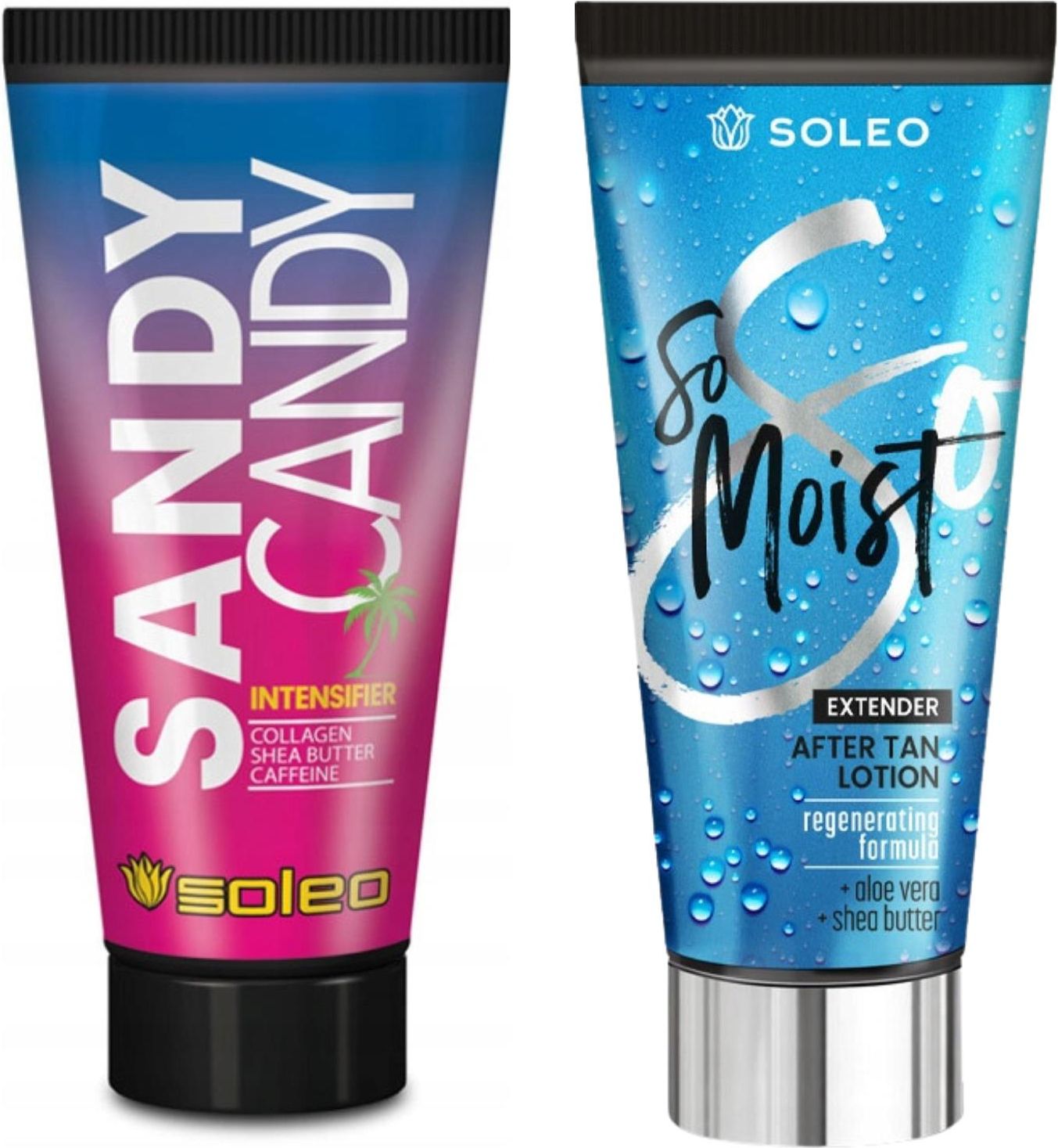 Soleo Sandy Candy + So Moist Po Opalaniu GratisSoleo Sandy Candy Mocny Przyspieszacz 150mlCiesz się z każdą chwilą, jak dziecko kiedy sięga po cukierki. Doceniaj proste radości, jak rozkosz smarowania ciała przyspieszaczem Sandy Candy. Jego orzeźwiająca woń porannej laguny przeniesie Cię w krainę relaksu, a aksamitna formuła cudownie zadba o doskonałą gładkość Twojej skóry, która stopniowo pokryje się zniewalającym odcieniem wakacyjnego brązu (tak działa tyrozyna i miedź). Dzięki obecności masła Shea i oleju z konopi skóra będzie odpowiednio odżywiona i wzmocniona, kolagen zadba o jej jędrność, a kofeina i ekstrakt z zielonej herbaty o atrakcyjny wygląd (działają anti-aging). A co z nawilżeniem? To zadanie w głównej mierze powierzyliśmy aloesowi, który dodatkowo koi i łagodzi. Wspaniale!Zapach: morning lagoonPrzyspieszacz Soleo Sandy Candy rekomendowany dla: osób opalających się nieregularnie, szczególnie tych o jasnej karnacji lub takich, które nie lubią stosować bronzerówSposób użycia:Nanieś równomierną warstwę przyspieszacza na całą powierzchnię ciała bezpośrednio przed sesją w solarium. Po aplikacji, umyj dokładnie ręce! Pamiętaj, że produkt przeznaczony jest wyłącznie do użytku zewnętrznego. Stosuj każdorazowo przed wizytą w solarium.Soleo So Moist Balsam Do Całego Ciała Po Opalaniu 150mlSo Moist to balsam przedłużający opaleniznę do codziennej pielęgnacji ciała. Specjalna regenerująca formuła intensywnie nawilża opaloną skórę. Dba o piękny blask i aksamitną miękkość.Ciesz się piękną opalenizną i zdrową skórą znacznie dłużej!Składniki aktywne: aloes, masło shea, olej szafranowy, witaminy B3, B6 ,hydrolizowane proteiny roślinneZapach: aqua kissBalsam Soleo So Moist rekomendowany dla: wszystkich osób opalających się solarium i na słońcu, po opalaniuSposób użycia:Równomierną ilość eliksiru rozprowadź na skórze całego ciała. Stosuj produkt po opalaniu, ale także jako codzienną pielęgnacją przeciwstarzeniową i kondycjonującą skórę. Możesz stosować produkt nawet dwa razy dziennie, według potrzeb i uznania.