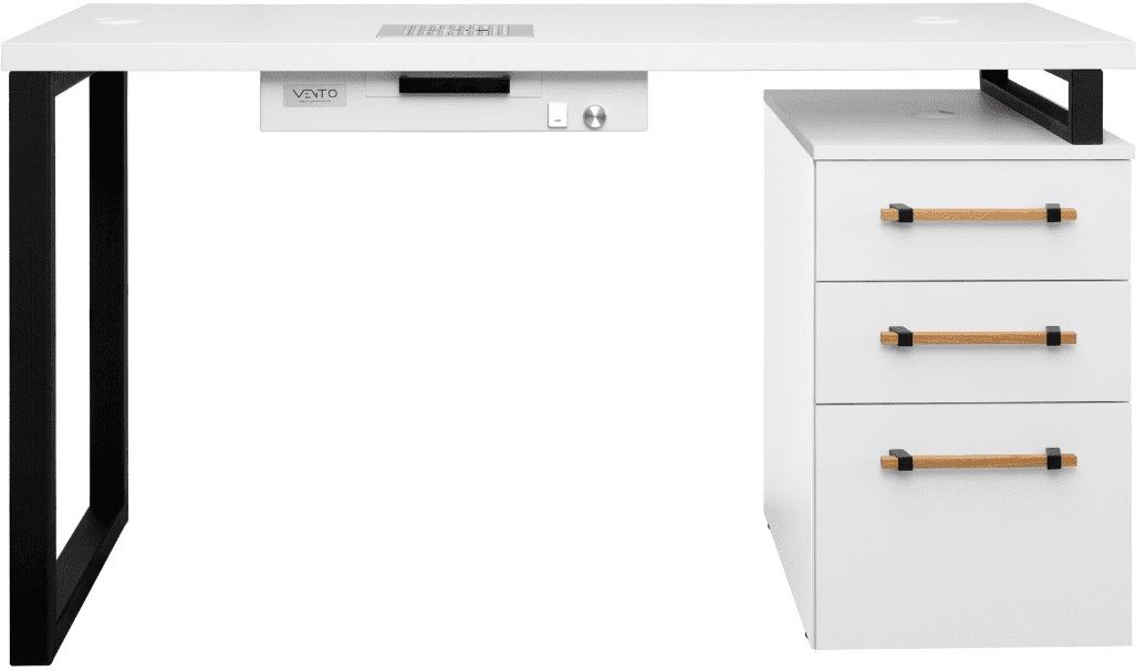 Opis Produktu Biurko Moderno 5 z pochłaniaczem pyłu VENTO PRO PLUS to eleganckie i funkcjonalne rozwiązanie dla profesjonalnych stylistek paznokci. Jego biały blat, połączony z białym kontenerem, tworzy harmonijną całość, którą przełamują podłużne drewniane uchwyty oraz czarne, malowane proszkowo …