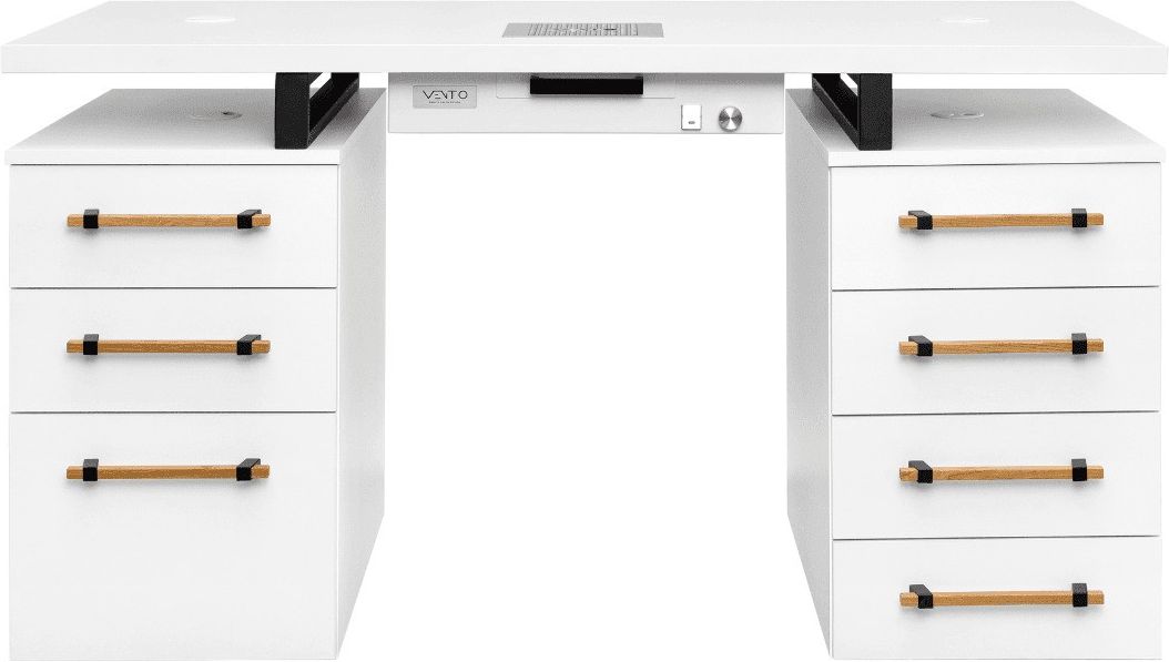 Opis Produktu Biurko Moderno Duo 5 z pochłaniaczem pyłu VENTO PRO PLUS to elegancka i funkcjonalna propozycja do nowoczesnych wnętrz. Charakteryzuje się ono prostą formą, która doskonale wpasuje się w estetykę loftowych salonów. Wykonane z połączenia białego blatu z białymi kontenerami oferuje zarówno estetykę, jak i praktyczność. Dodatkowym atutem są podłużne, drewniane uchwyty, które nadają całości nowoczesnego charakteru. Elementy łączące blat z kontenerami, wykonane z malowanej proszkowo stali, gwarantują trwałość i odporność na uszkodzenia. Biurko zostało wykonane z najwyższej jakości materiałów – blat pokryty został antybakteryjną powłoką stosowaną w laboratoriach. Zarówno powierzchnia blatu jak i reszta elementów jest matowa i odporna na zarysowania oraz chemię używaną podczas stylizacji paznokci. Nasze biurko to produkt zaprojektowany od A do Z z myślą o Twoich potrzebach jako stylistki paznokci. Pełną funkcjonalność i dużo miejsca na przechowywanie zapewniają dwa kontenery z szufladami po obu stronach biurka. Do Twojej dyspozycji jest łącznie 7 szuflad z cichym domykaniem. W każdym kontenerze znajdują się gniazda prądowe w ilości 5 sztuk oraz 2,5 mb przewodu zasilającego biurko. Wymiary biurka: 140 x 60 x 80 cm. Wszystkie materiały, które zostały użyte do wykonania biurka spełniają normy bezpieczeństwa oraz normy PN. W zestawie otrzymasz filtr węglowy oraz kratkę prostokątną. Cechy Produktu Elegancki design 🖌️: Prosta forma i nowoczesne drewniane uchwyty. Funkcjonalność 🗄️: 7 szuflad z cichym domykaniem i gniazda prądowe. Trwałość 🔧: Malowana proszkowo stal i antybakteryjna powłoka. Komfort pracy 💼: Matowa powierzchnia odporna na zarysowania i chemię. Regulowany pochłaniacz pyłu 🌬️: Moc zasysania od 200m3/h do 460m3/h. Zastosowanie Produktu Biurko Moderno Duo 5 z pochłaniaczem pyłu VENTO PRO PLUS jest idealnym rozwiązaniem dla stylistów paznokci, którzy cenią sobie estetykę i funkcjonalność. Dzięki antybakteryjnej powłoce i odporności na chemikalia, biurko doskonale sprawdzi się w salonach kosmetycznych, gdzie higiena i trwałość są kluczowe. Dodatkowe Informacje Gwarancja: 24 miesiące przy zakupie na paragon, 12 miesięcy na fakturę. Realizacja i Wysyłka: Czas realizacji do 14 dni roboczych. Biurko jest wysyłane na palecie, brak możliwości wniesienia. Montaż: Kontenery są złożone w całości. Blat z pochłaniaczem należy przykręcić do kontenerów. Pochłaniacz nie jest integralną częścią biurka, należy wybrać go w opcjach. Specyfikacja Techniczna Specyfikacja Szczegóły Wymiary biurka 140 x 60 x 80 cm Waga 90 kg Materiał Płyta meblowa laboratoryjna Blat Drewnopodobny z powłoką antybakteryjną Kolor Dąb halifax 3303 Moc 84 watt Zasilanie 230v Głośność na najwyższych obrotach 60 db Moc zasysania powietrza Regulowana od 200m3/h do 460m3/h Wymiary pochłaniacza 520mm x 290mm x 90mm Pochłaniacz Z pochłaniaczem, Bez pochłaniacza