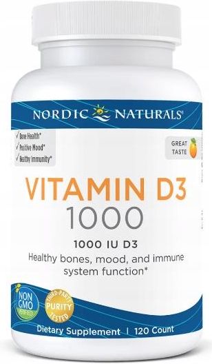 Nazwa produktu: Nordic Naturals, Witamina D3 1000, Pomarańczowa, 25 mcg (1,000 IU), 120 Mini Miękkich Żelków Data minimalnej trwałości: 11-2025 Zawartość opakowania: 120 szt. KOD EAN: 768990016004 >Opis ( Tłumaczenie AI ) Wspaniały Pomarańczowy Smak Wysoko Przyswajalny 1000 IU (25 mcg) D3 Łatwy do Przyjęcia Suplement diety Testowany na czystość przez stronę trzecią Testowany przez Igen Non-GMO Sprawdzone składniki Wspiera zdrowe kości, nastrój i funkcjonowanie układu odpornościowego. Witamina D od dawna znana jest z ważnej roli w regulowaniu poziomów wapnia i fosforu oraz zwiększaniu mineralizacji w kościach. Nordic Naturals Witamina D3 1000 to cholekalcyferol, naturalna i najłatwiej przyswajalna forma witaminy D, która wspiera zdrowie kości, nastrój i odporność oraz pomaga w regulacji rytmów snu. Każda porcja zapewnia 1000 IU witaminy D3 w organicznym oleju z oliwek tłoczonym na zimno. Najwyższa Jakość - Od pozyskiwania składników i tworzenia produktów po dostawę i obsługę klienta, zawsze dostarczamy najlepsze niezbędne składniki odżywcze. Stworzone z Integrytetem - Nasze produkty są oparte na nauce, formułowane z troską i pozyskiwane odpowiedzialnie dla zdrowia i spokoju Twojej rodziny. Składniki dodatkowe: Organic extra virgin olive oil, soft gel capsule (gelatin, glycerin, purified water, natural flavor), rrr-alpha tocopherol (antioxidant), vitamin D3 (olive oil, cholecalciferol), natural flavor, rosemary extract (a natural preservative). No gluten, milk derivatives, wheat, soy, or artificial colors or flavors. This product and its ingredients do not contain common GE genes or proteins. Sugerowane użycie: ' Biotin is a water-soluble B-vitamin that helps hair growth and improves overall hair health. Jedna kapsułka dziennie, z jedzeniem, lub według zaleceń lekarza czy farmaceuty. Biotyna jest witaminą z grupy B rozpuszczalną w wodzie, która pomaga w wzroście włosów i poprawia ogólne zdrowie włosów.