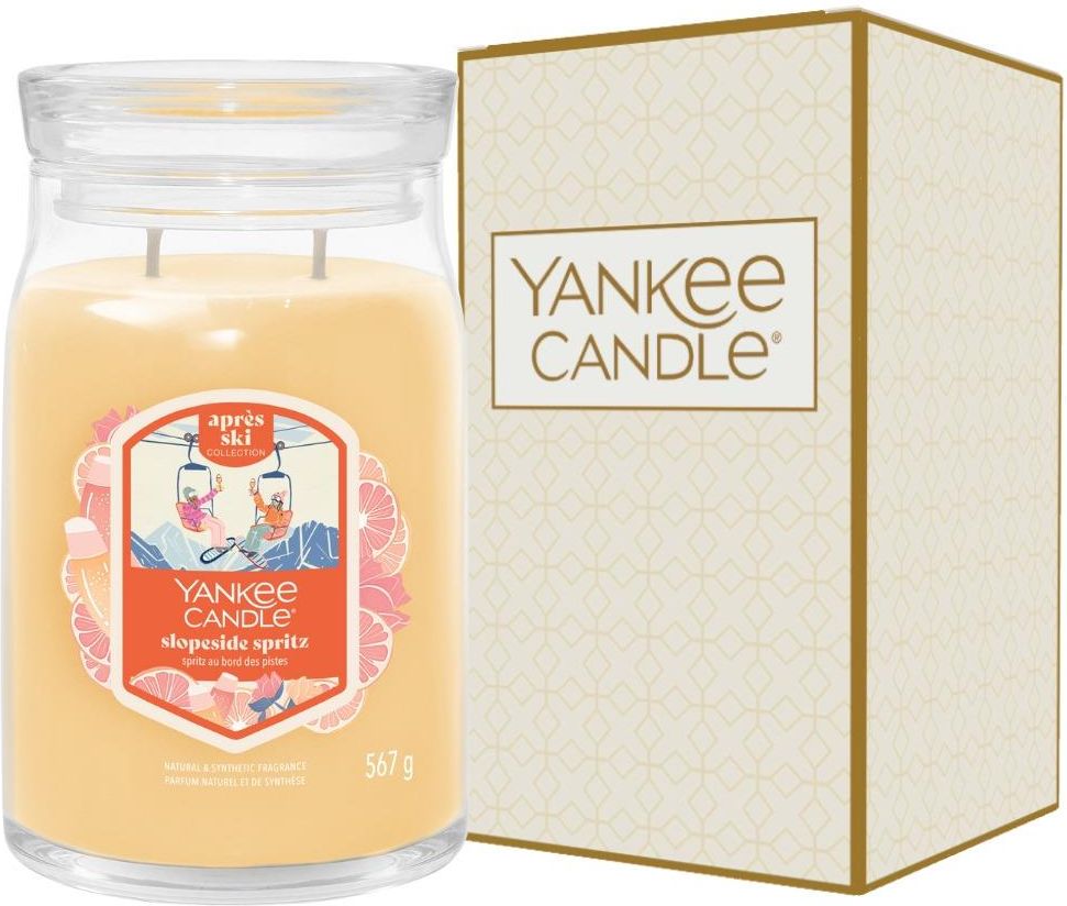 Yankee Candle Świeca w Dużym Słoiku Slopeside Spritz Yankee Candle Slopeside Spritz to radosna i musująca kompozycja, która przywołuje klimat zimowych spotkań przy kieliszku prosecco. Zapach otwiera się soczystymi nutami jabłka, rabarbaru i ananasa. W sercu rozkwita świeżość róży i grejpfruta, a całość wieńczą musujące akordy prosecco, dodając całości lekkości i eleganckiego charakteru. Nowa linia Signature od Yankee Candle to odświeżony design słoika, dwa bawełniane knoty i mieszanka wosku sojowego, która gwarantuje równomierne spalanie. Ręcznie ilustrowane etykiety i żywe barwy wosku nadają świecy wyjątkowego uroku, czyniąc ją zarówno źródłem pięknego aromatu, jak i elegancką dekoracją wnętrza. Dlaczego warto wybrać Yankee Candle Świeca w Dużym Słoiku Slopeside Spritz? - Owocowo-musująca kompozycja z akordem prosecco - Dwa bawełniane knoty zapewniają równomierne spalanie - Mieszanka wosku sojowego o wysokiej jakości - Ręcznie ilustrowana etykieta i nowoczesny design Signature Sposób użycia Przed każdym paleniem przytnij knoty do wysokości 3 mm, aby świeca spalała się czysto. Podczas pierwszego użycia pozwól, aby wosk roztopił się do brzegów szkła. Do gaszenia stosuj zagaszacz, a świecę zakończ palenie, gdy pozostanie około 1 cm wosku na dnie. Pojemność: 567g