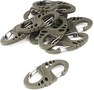 MIL-TEC S-HOOK KARABIŃCZYKI POMOCNICZE 10 szt Olive [13458401] Parametry Model: Karabinek S-Hook Producent: Mil-Tec, Niemcy Materiał: polimer POM (100% Polyoxymethylen) Lekkie i niezwykle wytrzymałe Odporne na ścieranie i chemikalia Duża sztywność i wytrzymałość na rozciąganie Odporność na skrajne temp. od -50 do +90°C Typ S, asymetryczny - uniwersalny Zamek sprężynujący, samozamykający Możliwość łączenia w pary i łańcuch Waga (1 szt): ok. 3,5 g Kolor: Olive Zestaw praktycznych karabinków S-Hook od niemieckiej marki Mil-Tec. Wykonane zostały z wysokiej jakości polimeru, który jest odporny na ścieranie, skrajne temperatury oraz chemikalia. Posiadają uniwersalną asymetryczną budowę typu S. Ramiona zamykające dają dużo większy prześwit niż w klasycznych karabinkach. Ramię zamykane automatycznie jest sprężynujące. Występy zaczepiają się o ramię zwiększając wytrzymałość wzdłużną, podczas rozciągania karabinka blokują się. Istnieje możliwość łączenia karabinków w pary lub łańcuch. Doskonałe do podczepiania części oporządzenia i wyposażenia. Idealne do zaczepiania rękawic, kluczy, latarki lub noża. Karabinki umożliwiają mocowanie na D-ringach, szlufkach czy pętelkach.