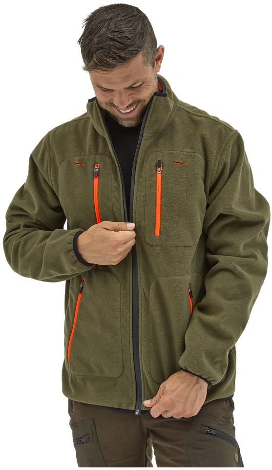 Wiatro- i wodoodporna kurtka polarowa o dobrej oddychalności. Zielony tył i przód z pomarańczowym nadrukiem i czterema kieszeniami.