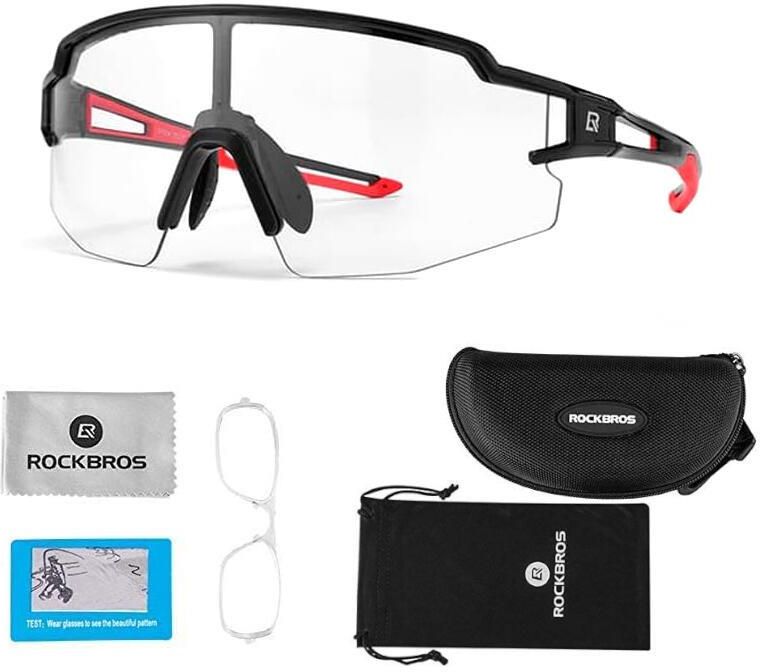 OKULARY SPORTOWE ROCKBROS FOTOCHROMOWE NA ROWER Uniwersalne okulary sportowe marki ROCKBROS to idealny produkt dla osób aktywnych. Mogą być wykorzystane podczas jazdy na rowerze, wędkowania, biegania, wspinaczki w pochmurną i słoneczną pogodę. Cechy produktu: ✔️ Soczewka fotochromowa w zależności od intensywności światła soczewek same się ściemniają lub rozjaśniają ✔️ Ochrona UV400: 100% ochrona przed promieniowaniem UVA, UVB. ✔️ Okulary są ultralekkie ✔️ Dzięki antypoślizgowym noskom i gumowym nausznikom możesz nosić okulary wygodniej przez długi czas Zestaw zawiera: ✔️ Oprawka z soczewkami ✔️ Ramka optyczna do szkieł korekcyjnych ✔️ Woreczek na okulary ✔️ Ściereczka z mikrofibry ✔️ Etui na zamek Specyfikacja: ✔️ Lekkie, elastyczne, wytrzymałe na uderzenia ✔️ Odporne na zniekształcenia ✔️ Gumowe noski i wstawki w zausznikach ✔️ Dodatkowe otwory wentylacyjne ✔️ Waga: około 30 g ✔️ Kolor oprawki: Czarno-czerwony