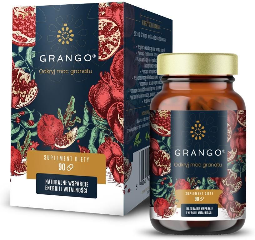 Grango, naturalne wsparcie energii i witalności 90 kapsułek Moc Granatu Grango Suplement Nutraceutyczny 100% naturalny! Jedyna na rynku 40% Punikalagina z skórki granatu odpowiada za wsparcie Twojej Energii Komórkowej już na poziomie mitochondrialnym wspierając Twoje ciało i umysł w najważniejszym źródle jakim są nasze Mitochondria. 90 kapsułek vege suplement diety Naturalna Energia Komórkowa Pierwsze na rynku źródło 40% Punikalaginy z skórki granatu wspierającej Mitochondria Najwyższe stężenie granatu DER 40:1 Skompresowana moc aż 40 kg Granatów w każdym kilogramie GRANGO Polska Nagroda Jakości 2024 866 mg Granatu w dawce, 100% naturalny, brak uzupełniaczy, kapsułki Vege Suplement Roku 2025 Dzienna dawka GRANGO® zawiera 15 razy więcej czystej punikalaginy z skórki granatu niż w 1 litrze soku. Żyjesz, bo wytwarzasz Energię Do dziś nie istnieje definicja "życia" a jednego czego jesteśmy pewni to tego, że życie wiąże się z wytwarzaniem energii. Jeśli wytwarzasz energię to znaczy, że żyjesz, jeśli nie wytwarzasz, to lekarz stwierdza zgon. Mitochondria to centra energii Twojego organizmu – ich sprawność decyduje o Twojej sile, kondycji, wyglądzie, witalności i skuteczności w działaniu każdego dnia.To właśnie w mitochondriach zachodzi proces metabolizmu energetycznego, podczas którego wytwarzana jest energia (ATP) niezbędna do życia. Z wiekiem ich sprawność i zdolność naprawcza spada — nawet o 0,6% rocznie. Po 40 roku życia mitochondria mogą produkować aż o 30-50% mniej energii niż w młodości. To naturalny proces, który zaczynasz odczuwać — spowolniony metabolizm, brak energii, spadek libido, uczucie zmęczenia, obniżona odporność, utrata jędrności skóry. Co czujesz dbając o mitochondria? Masz więcej naturalnej energii – bez kawy, bez drzemek w ciągu dnia Twoje hormony się wyciszają – znów jesteś sobą, bez wahań nastroju i napięcia Czujesz większe libido, chęci i więcej przyjemności z bliskości Regenerujesz się szybciej – zarówno fizycznie i emocjonalnie Twoja skóra odzyskuje blask, wolniej się starzeje, szybciej regeneruje Wzmacniasz serce i krążenie – czujesz to w codziennej aktywności Śpisz głębiej i spokojniej, efektywniej - bez nocnych przebudzeń Spalasz kalorie sprawniej, a Twoje ciało współpracuje z Tobą Działasz z lekkością – bardziej efektywnie, z większym spokojem Wzrasta Twoja produktywność, myślisz i koncentrujesz się sprawniej Czujesz, że ŻYJESZ! GRANGO® Dusza Mitochondriów GRANGO® jedyny na rynku Nutraceutyk, który w swoim składzie zawiera potężne stężenie DER 40:1 Granatu, który od tysięcy lat uznawany jest za symbol życia, siły i długowieczności poprzez cenną Punikalaginę. Ceniony w kulturach starożytnych za swoje wyjątkowe właściwości, od zawsze stanowił klucz do wsparcia mitochondriów i przekładała się na niesamowitą odporność, siłę, kondycję fizyczną i psychiczną a przede wszystkim energię niezbędną do codziennego funkcjonowania. Polifenole, w tym punikalagina, to nutraceutyki – bioaktywne składniki pozyskane z żywności, które dzięki standaryzacji i odpowiedniemu stężeniu wyizolowanych z pożywienia związków mogą wspierać funkcje organizmu na poziomie komórkowym. Twoja Strategia na WIĘCEJ Punikalagina, kluczowy polifenol z granatu o zdecydowanie wyższej wchłanialności niż kwas elagowy, wykazuje silne właściwości przeciwzapalne i przeciwutleniające, wspierając zdrowie mitochondriów. Badania wykazały, że Punikalagina daje granatowi wyjątkowe właściwości antyoksydacyjne, z czego 87% tych właściwości przypisuje się właśnie jej działaniu. Hamuje procesy zapalne w komórkach mikrogleju, chroniąc neurony, oraz zapobiega glikacji białek, która prowadzi do ich uszkodzenia. Dzięki temu punikalagina przyczynia się do poprawy funkcjonowania mitochondriów. Wzmacniaj mitochondria, jeśli Żyjesz intensywnie, szybko – nie odpoczywasz, dużo od Ciebie zależy. Jesteś w ciągłym biegu - działasz pod presją czasu, często w stresie. Mimo snu i odpoczynku – czujesz się notorycznie zmęczony, bez sił i energii. Coraz trudniej się skupić, a zmęczenie przychodzi szybciej niż kiedyś. Zauważasz spadek libido, mniej chęci do bliskości i aktywności. Twoja skóra wygląda na zmęczoną, traci jędrność – szybciej się starzeje. Metabolizm spowolnił, a organizm dłużej wraca do formy po wysiłku. Sekret składu GRANGO® Granat Korzystne działanie fizjologiczne i terapeutyczne właściwości granatu przypisuje się wysokiej zawartości związków fenelowych, polifenoli, związków o bardzo dużym potencjale przeciwutleniającym, które sprzyjają ochronie komórek przed stresem oksydacyjnym. Większość związków fenolowych wykazuje silne właściwości przeciwutleniające i przeciwrodnikowe stanowiąc nieenzymatyczny system obrony antyoksydacyjnej. Punikalagina jeden z najsilniejszych antyoksydantów, należąca do rodziny elagotanin, odpowiada za ponad połowę działania antyoksydacyjnego granatu, a jej największe stężenie znajduje się w skórce – zewnętrznej warstwie owocu. W GRANGO® wykorzystujemy ekstrakt z granatu o najwyższym stężeniu DER 40:1, zawierający aż 40% punikalaginy, dzięki temu niemal połowa zawartości kapsułki to czysty składnik aktywny w postaci Punikalaginy. Badania Eurofins potwierdzają ilość punicalaginy w kapsułce Grango Mango Afrykańskie jest bogate w błonnik, witaminy, minerały i inne składniki odżywcze, które wspierają zdrowie na wiele sposobów. Jej unikalne właściwości sprawiają, że jest doskonałym wsparciem w procesie odchudzania.Badania wykazują, że pestka mango wspomaga odchudzanie poprzez regulację apetytu, zmniejszenie wchłaniania tłuszczu i zwiększenie uczucia sytości. Składniki: ekstrakt z granatu DER 40:1, standaryzowany na 40% Punicalaginu, Ekstrakt z afrykańskiego mango DER 20:1, 