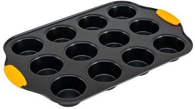 Prostokątna forma do pieczenia muffinek z 12 wgłębieniami o wymiarach wewnętrzny wgłębień 6.5x3 cm ze stali węglowej z nieprzywierająca powłoka Xylflon. Brytfanna z silikonowymi uchwytami wytrzymującymi temperaturę 210℃. Zalecane mycie ręczne.